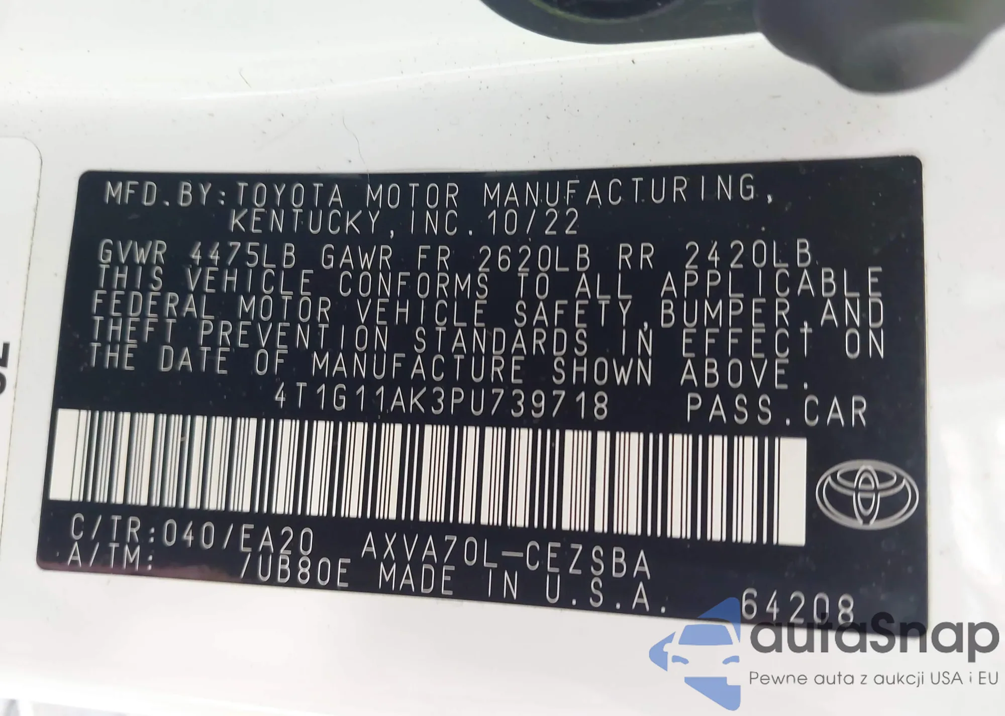 LOT: 43159222 VIN: 4T1G11AK3PU739718