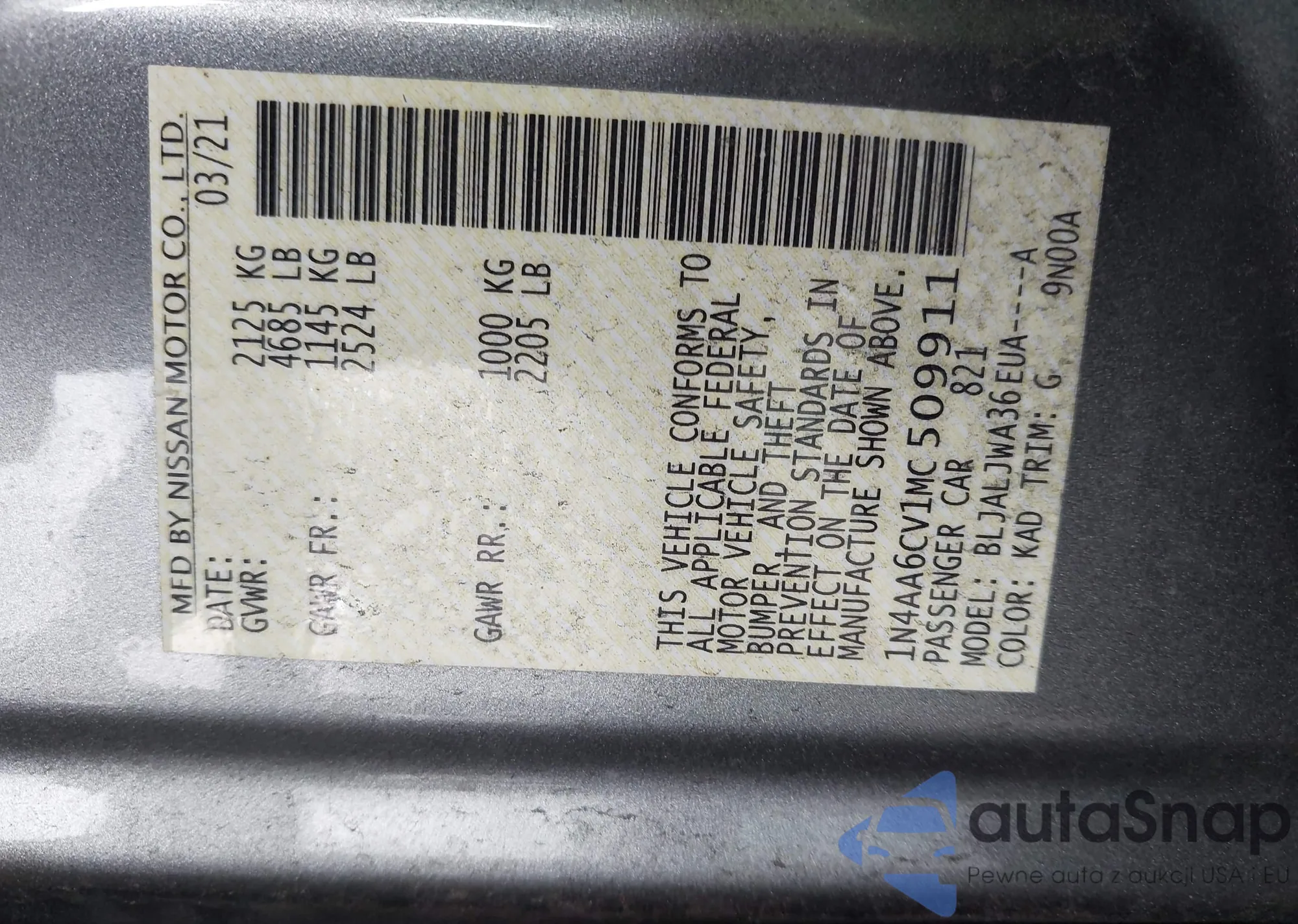 • VIN 1N4AA6CV1MC509911