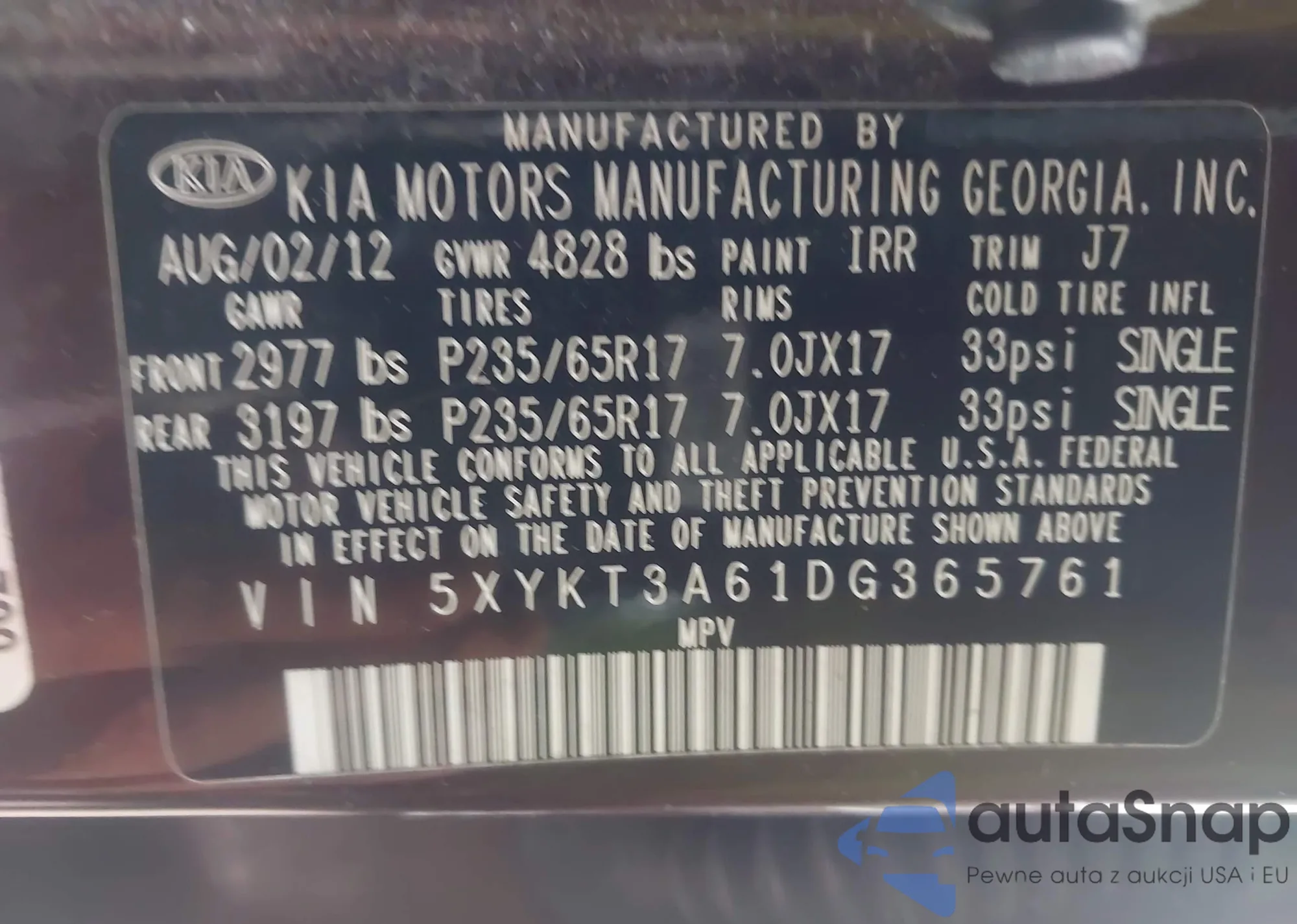 • VIN 5XYKT3A61DG365761