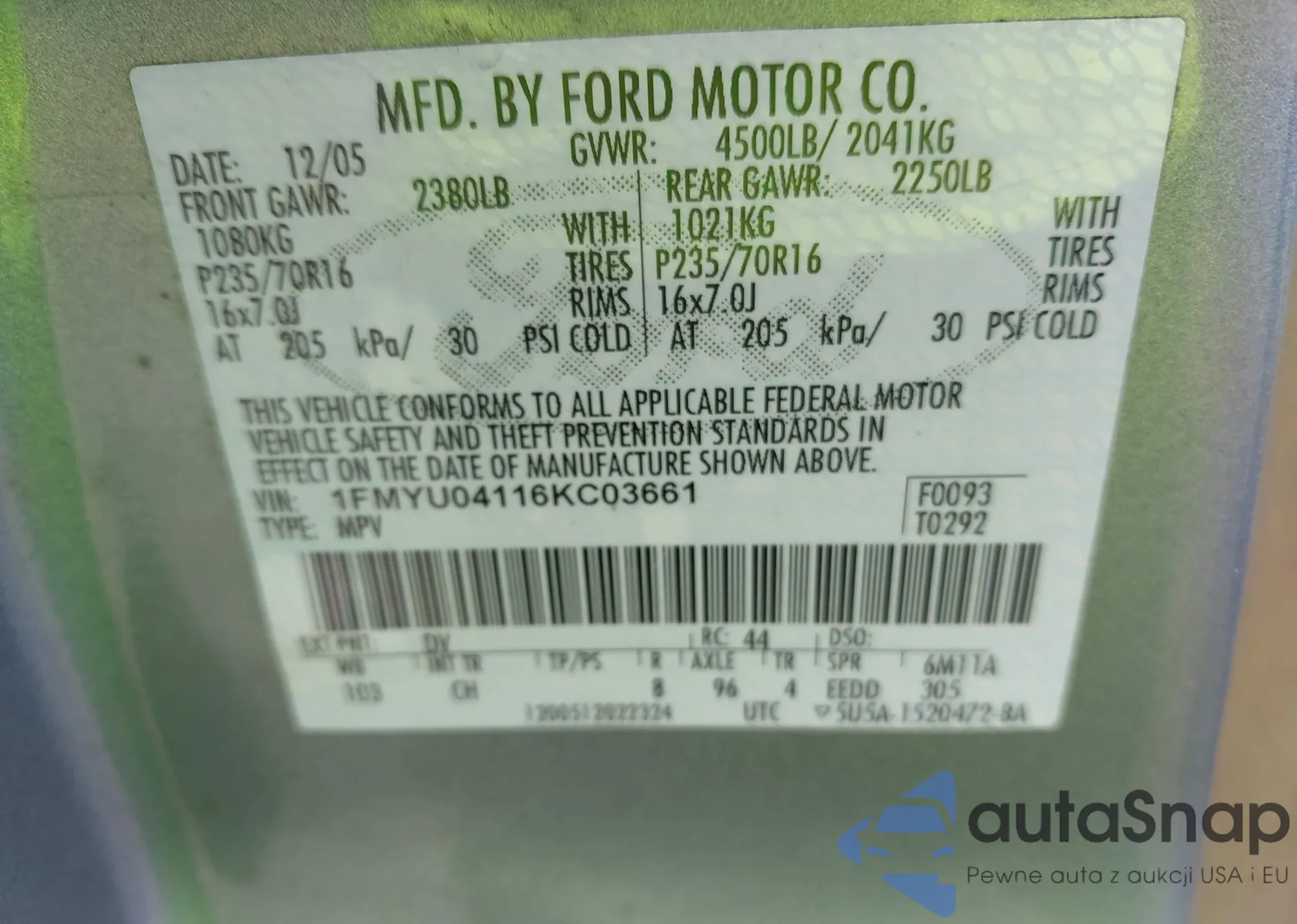 LOT: 43285548 VIN: 1FMYU04116KC03661