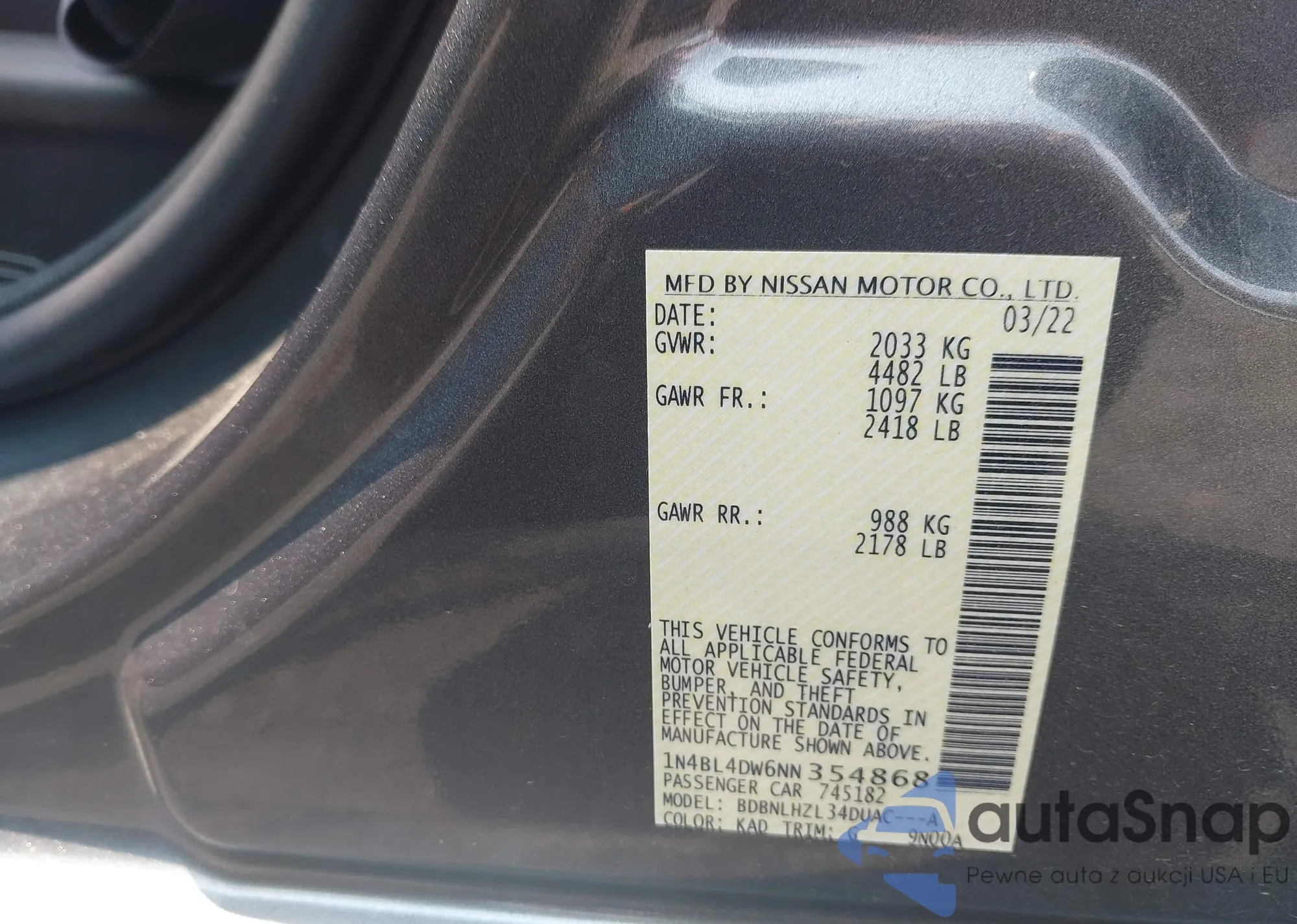 LOT: 42487031 VIN: 1N4BL4DW6NN354868