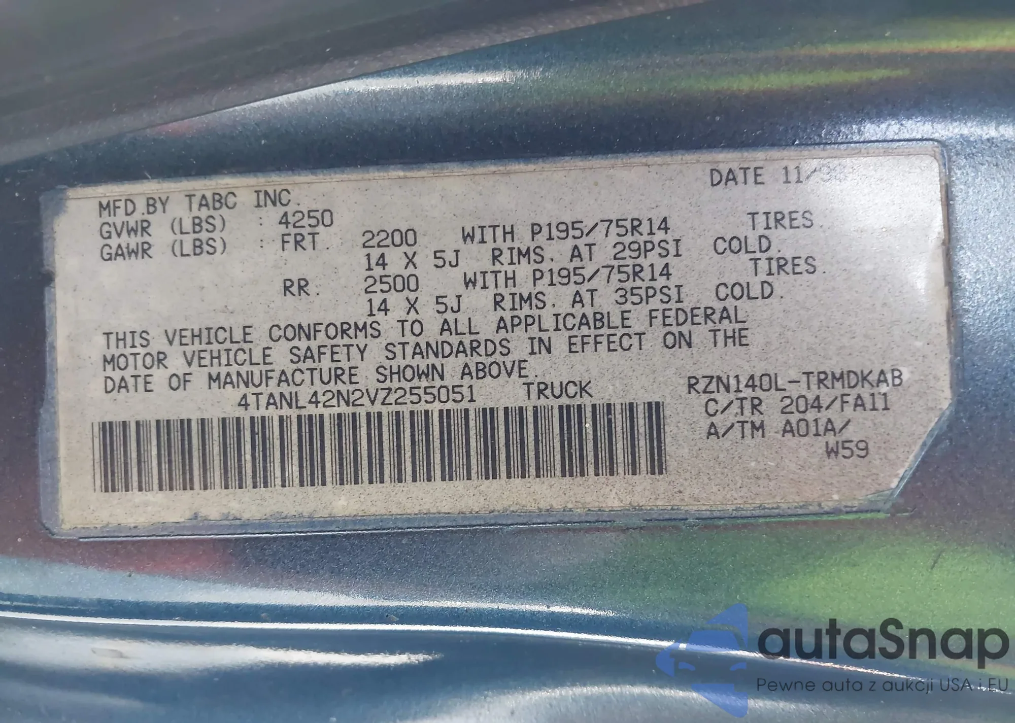 • VIN 4TANL42N2VZ255051