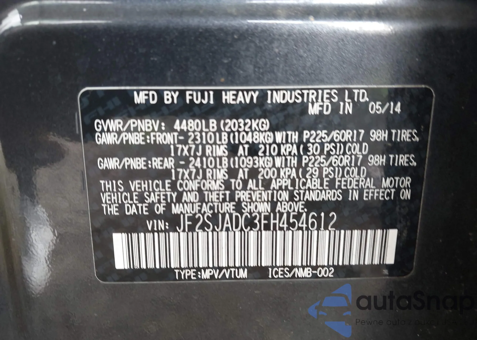 • VIN JF2SJADC3FH454612