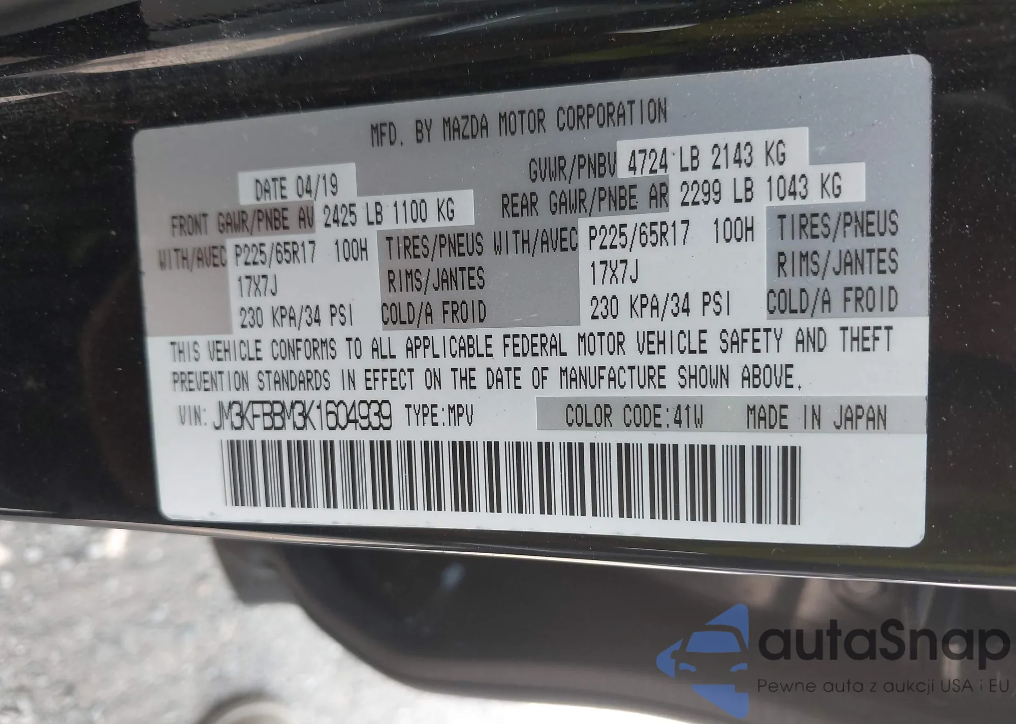 LOT: 42829900 VIN: JM3KFBBM3K1604939