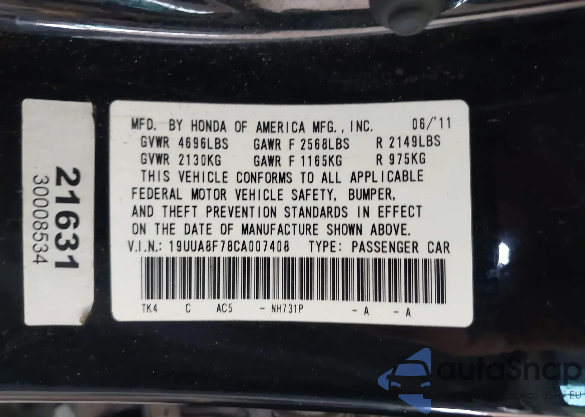 LOT: 43113261 VIN: 1HGCP36829A013509