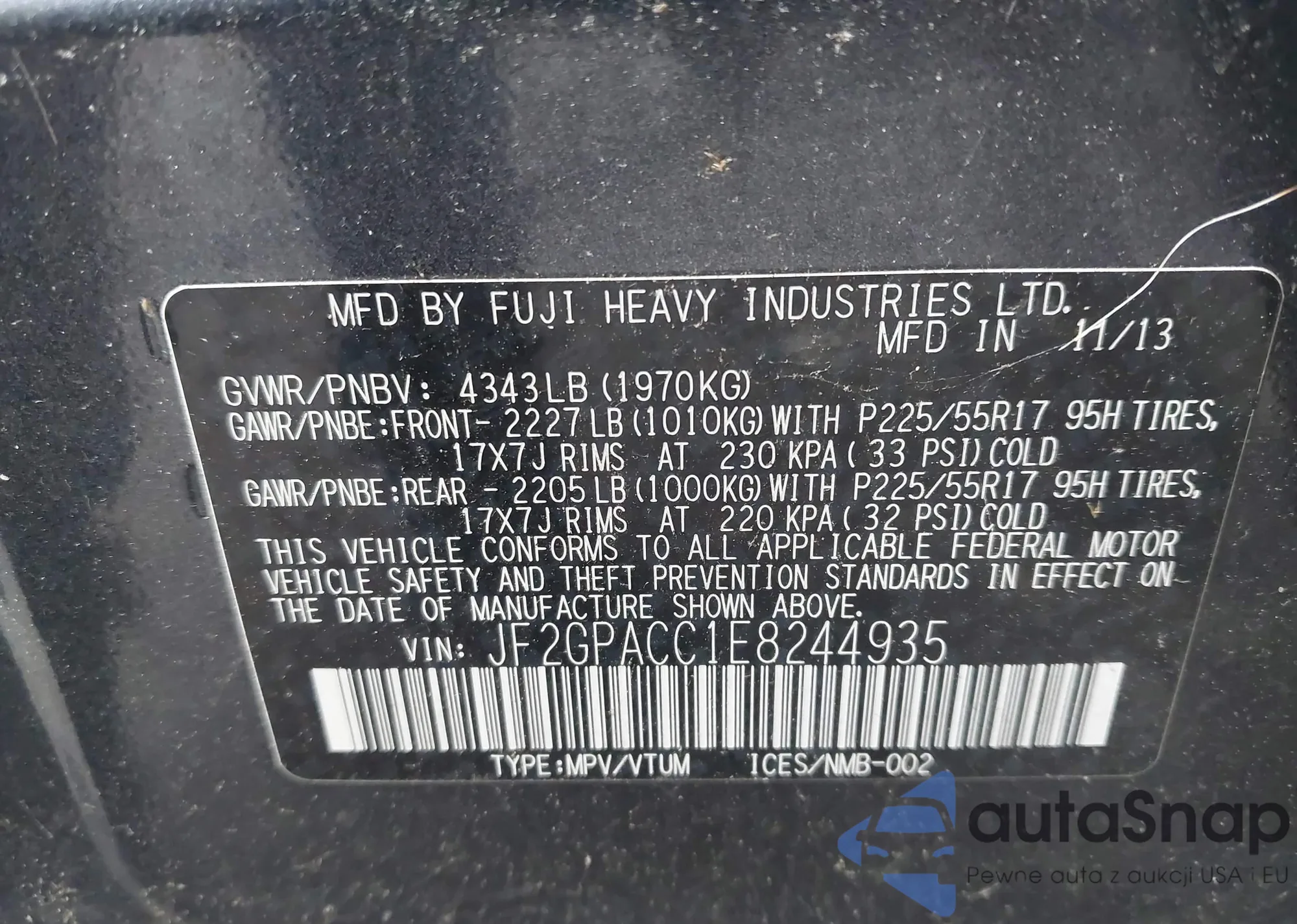 LOT: 43296985 VIN: JF2GPACC1E8244935