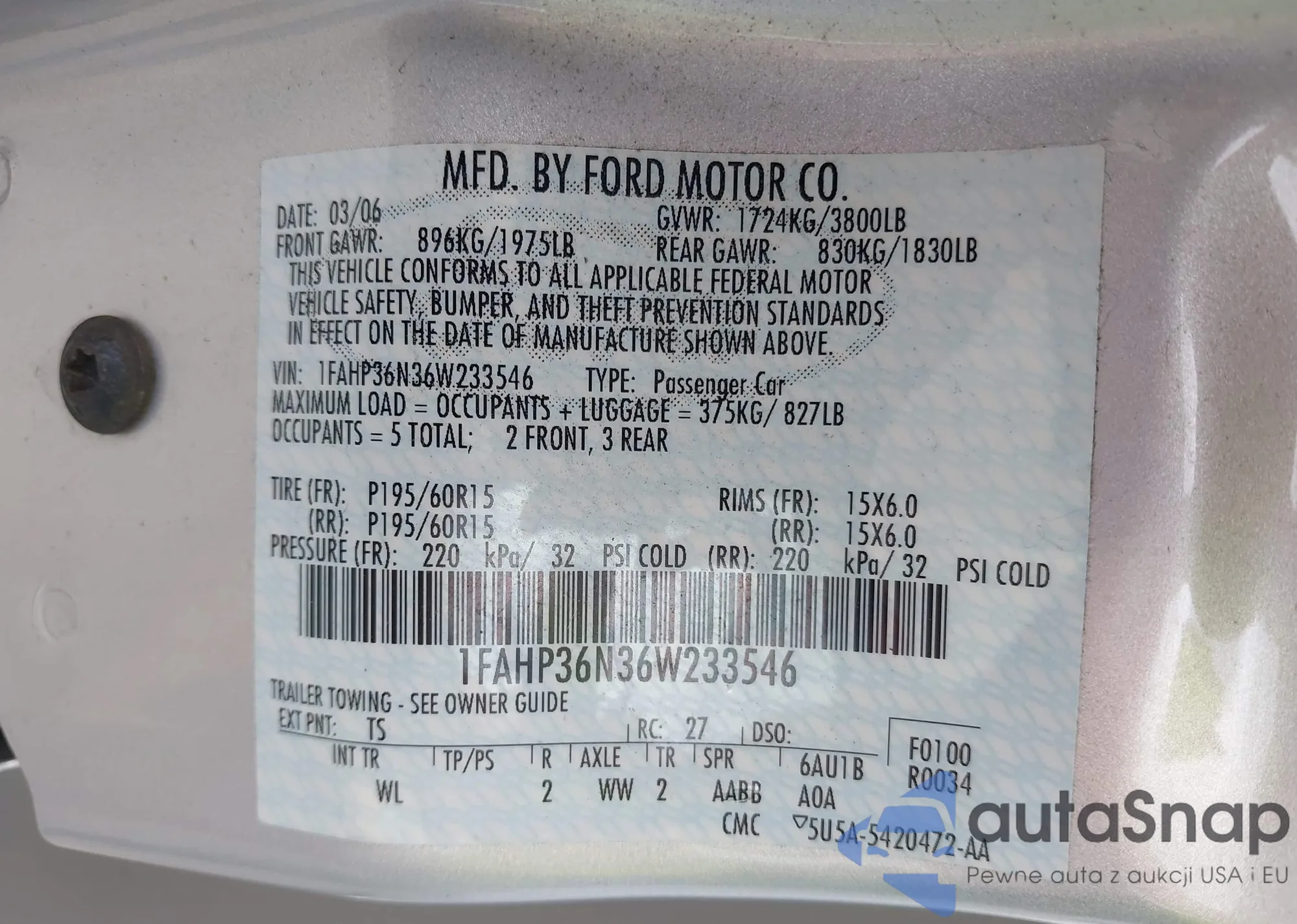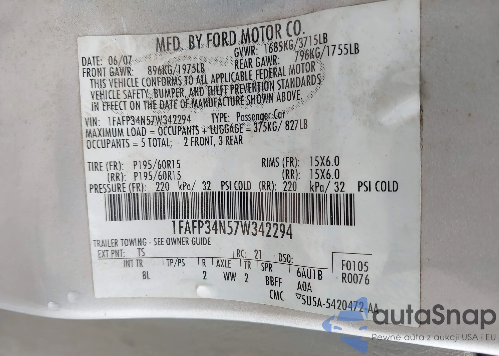 LOT: 43336523 VIN: 1FAFP34N57W342294