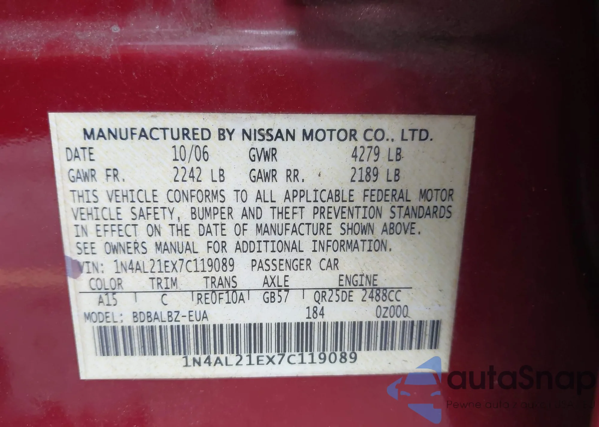 • VIN 1N4AL21EX7C119089