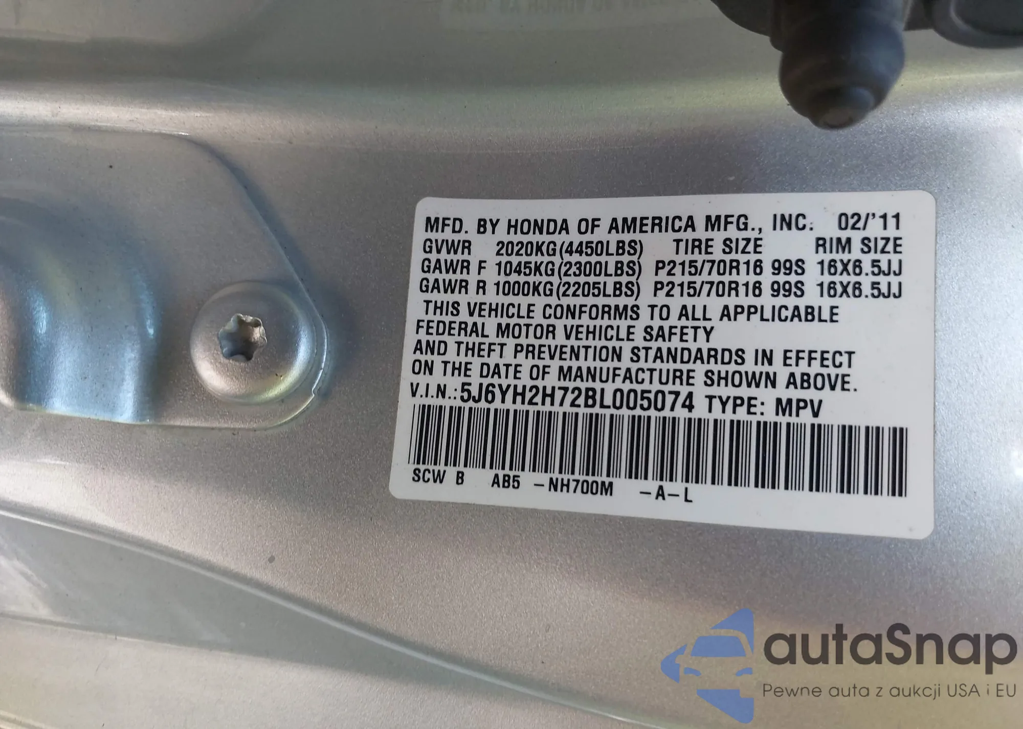 • VIN 5J6YH2H72BL005074