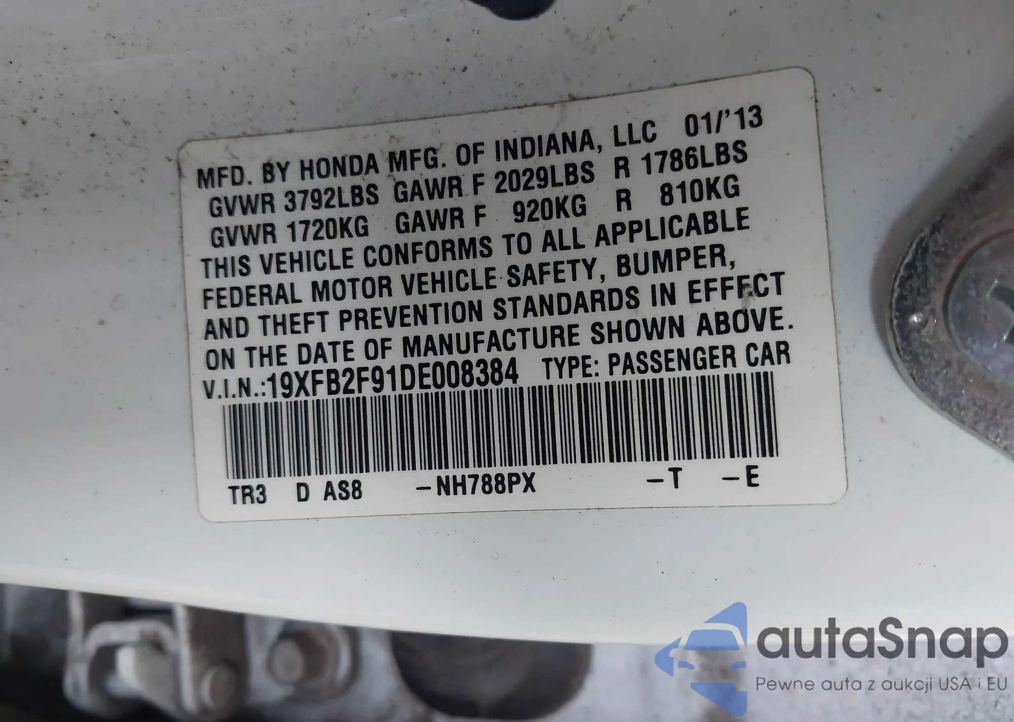 LOT: 43357046 VIN: 19XFB2F91DE008384
