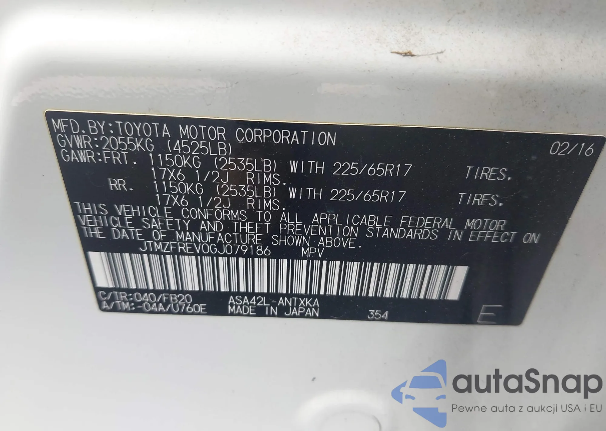 LOT: 43211953 VIN: JTMZFREV0GJ079186