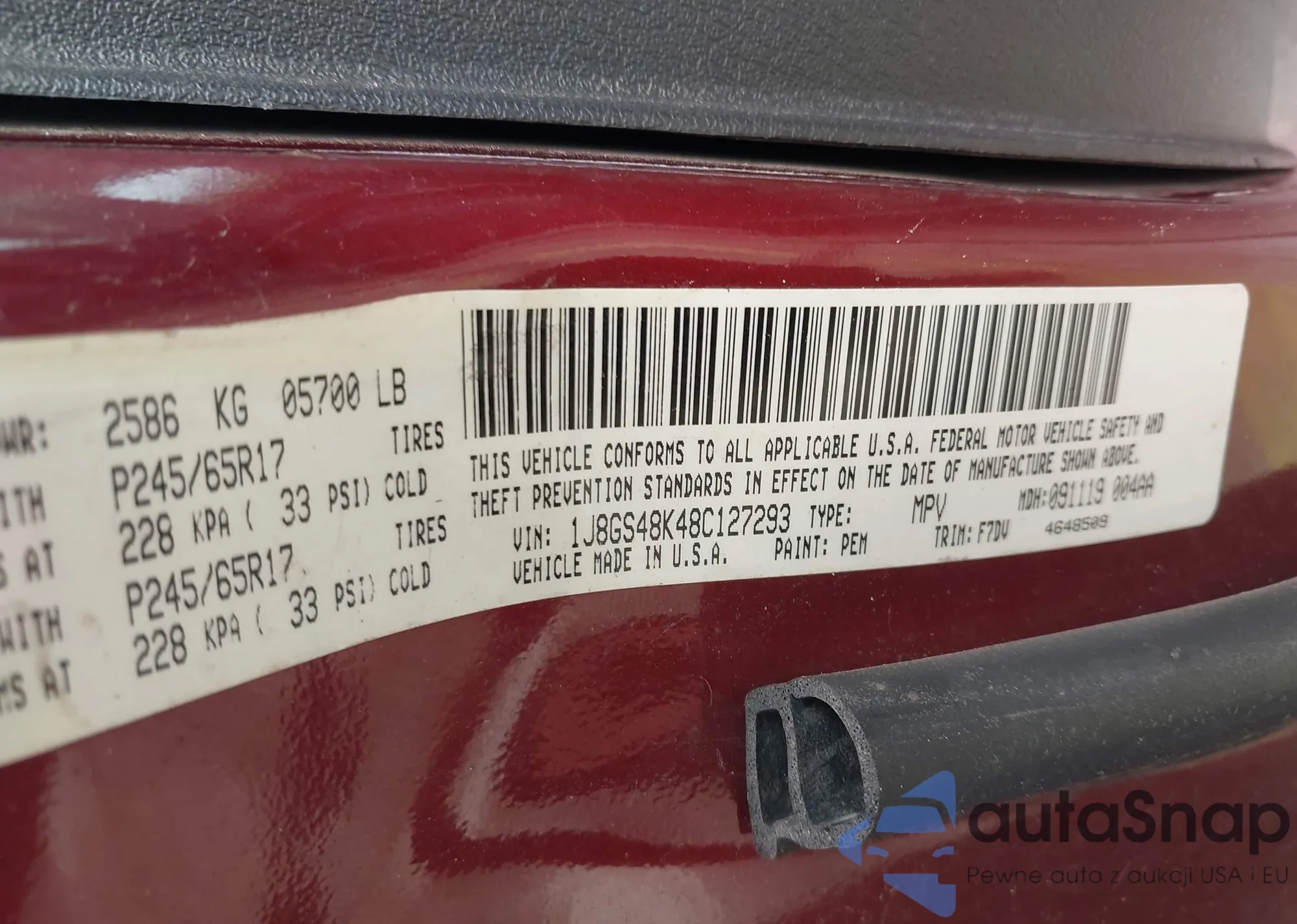 LOT: 43193581 VIN: 1J8GS48K48C127293