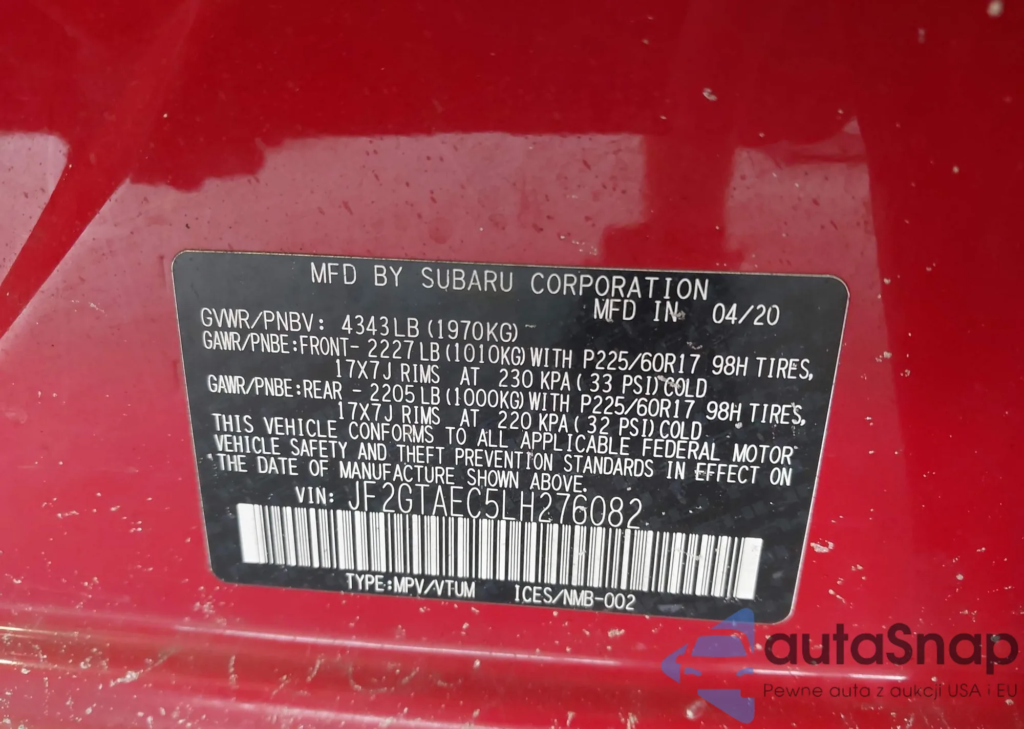 LOT: 43214197 VIN: JF2GTAEC5LH276082