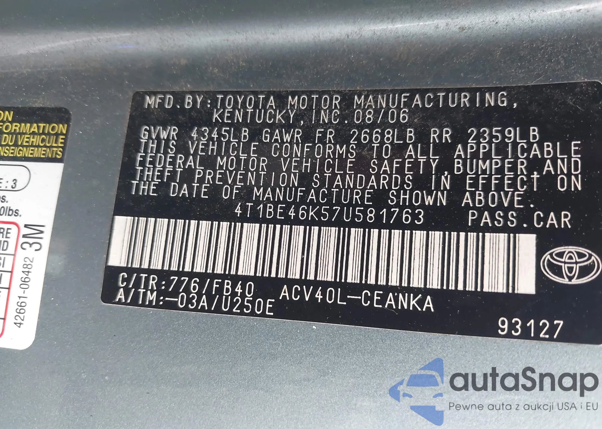 • VIN 4T1KZ1AK9RU099536