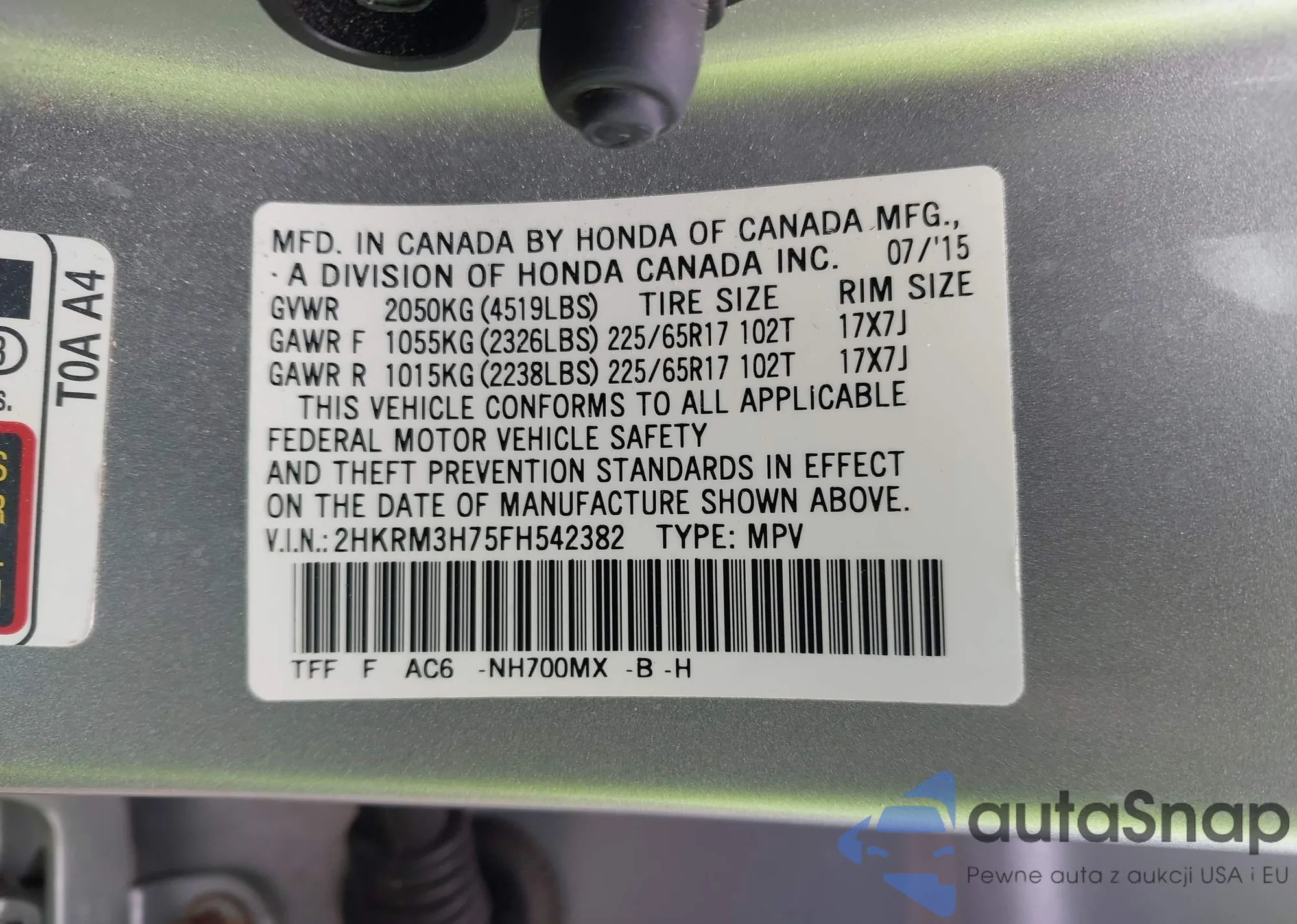• VIN 2HKRM3H75FH542382