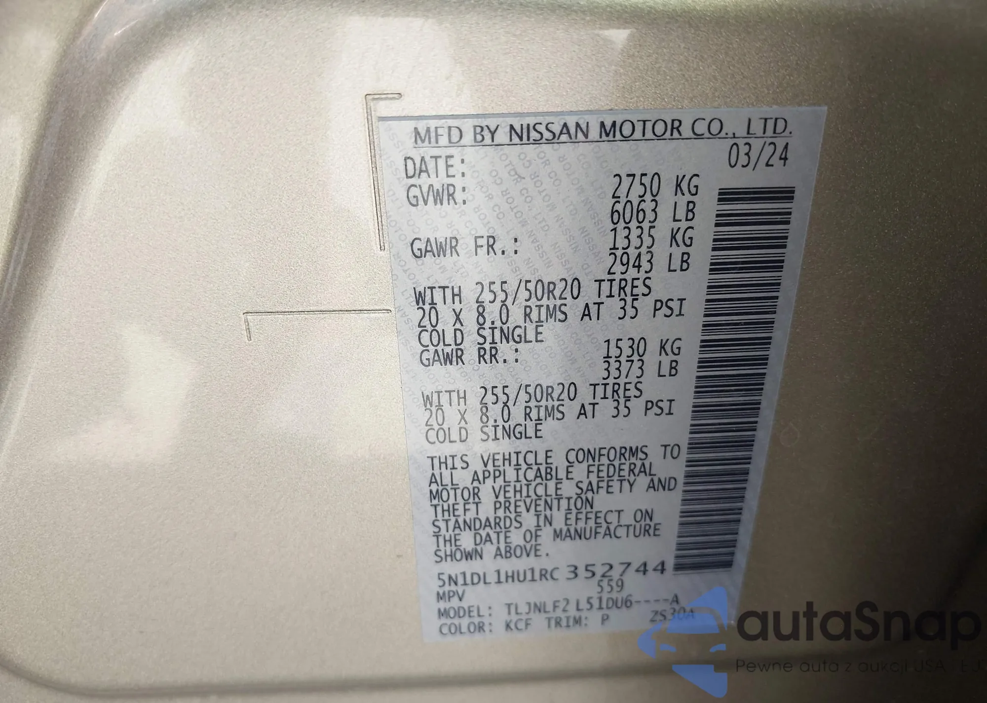 LOT: 43310544 VIN: 5N1DL1HU1RC352744