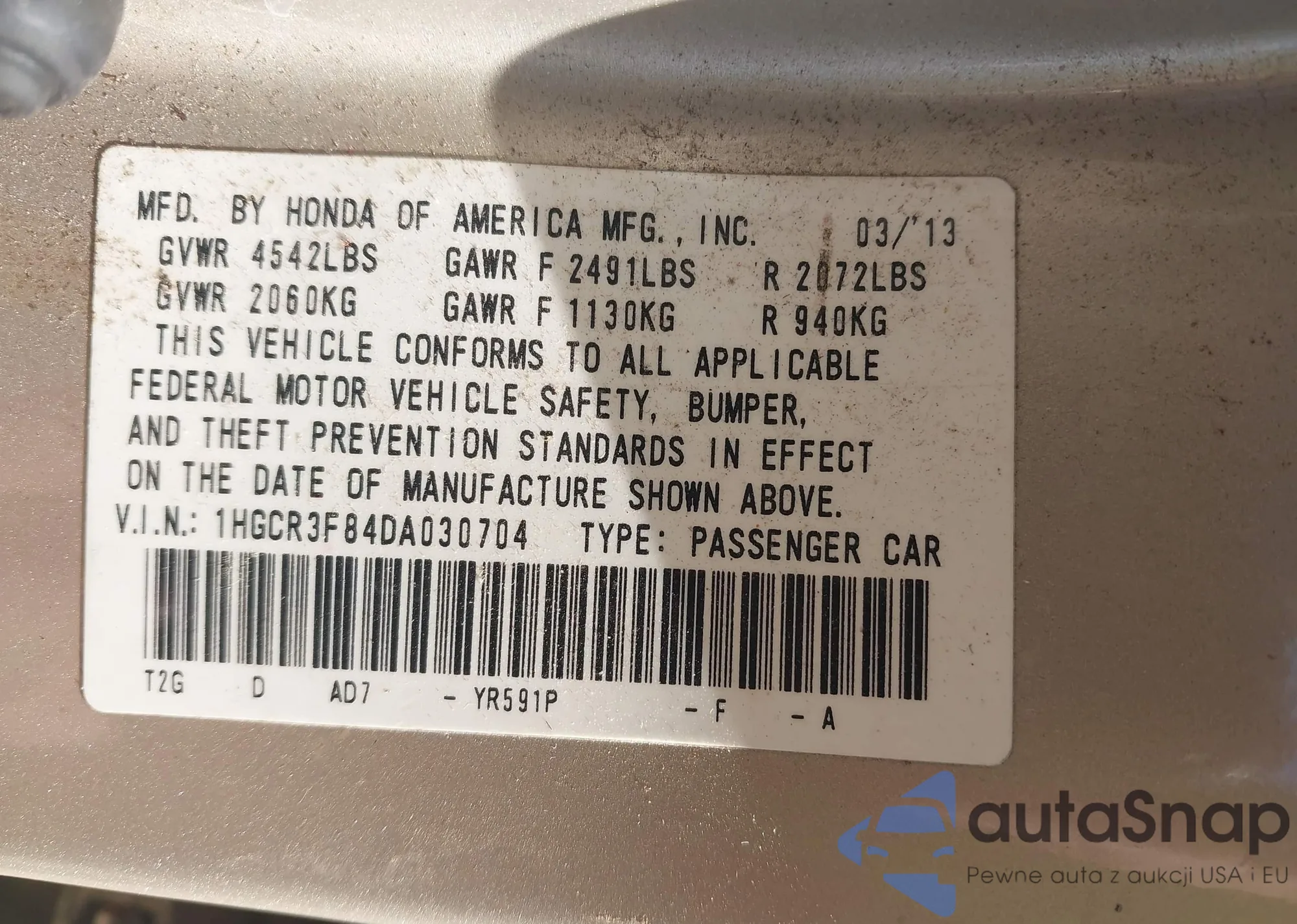 LOT: 43335562 VIN: 1HGCR3F84DA030704