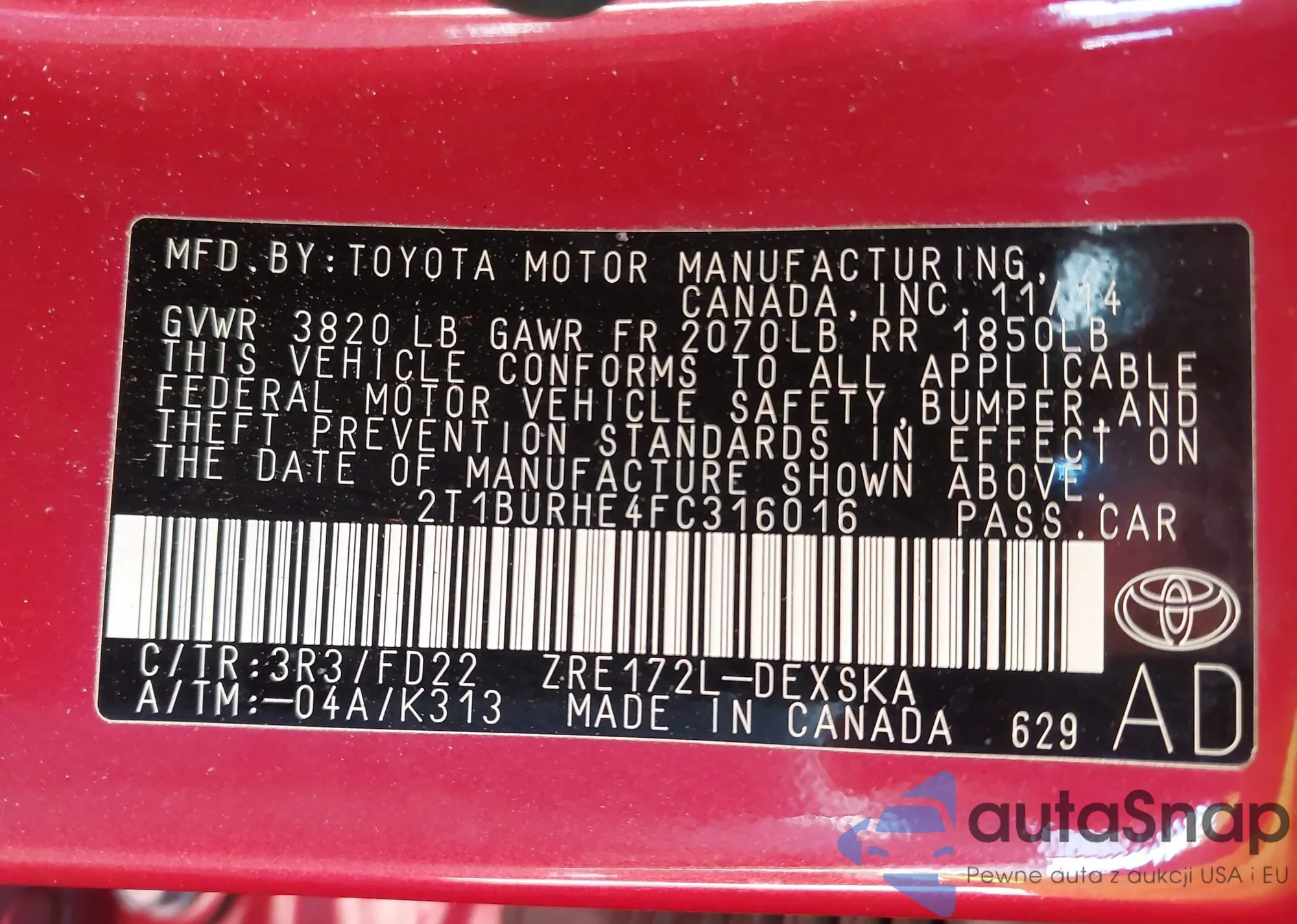 LOT: 43356931 VIN: 2T1BURHE4FC316016