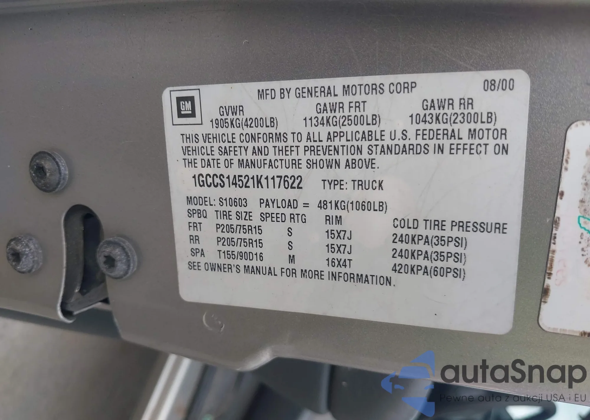 LOT: 42628235 VIN: 1GCCS14521K117622