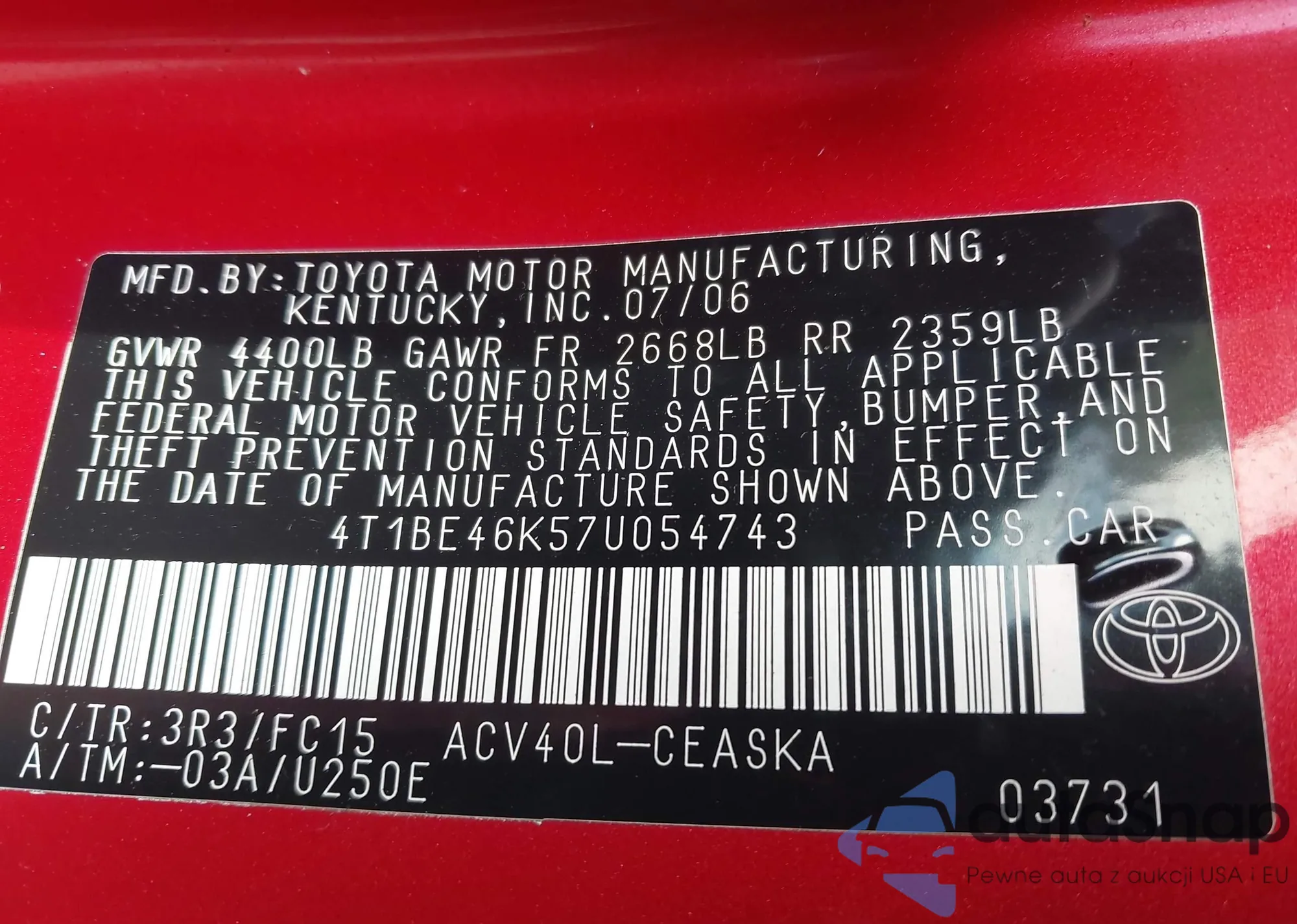 LOT: 43208001 VIN: 4T1BE46K57U054743