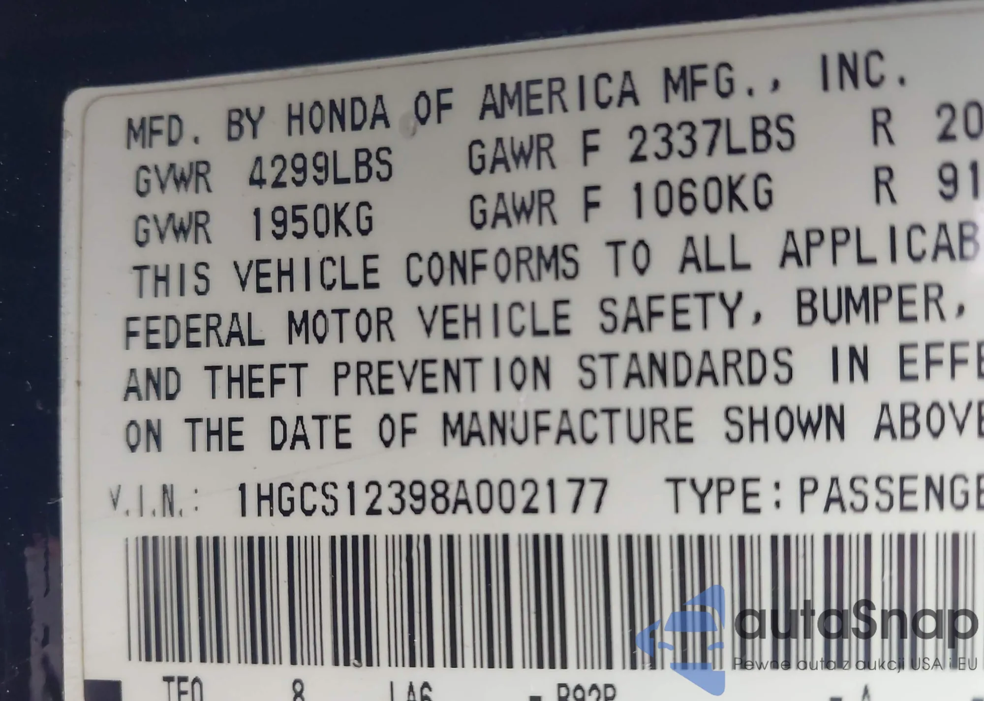 • VIN 1HGCS12398A002177