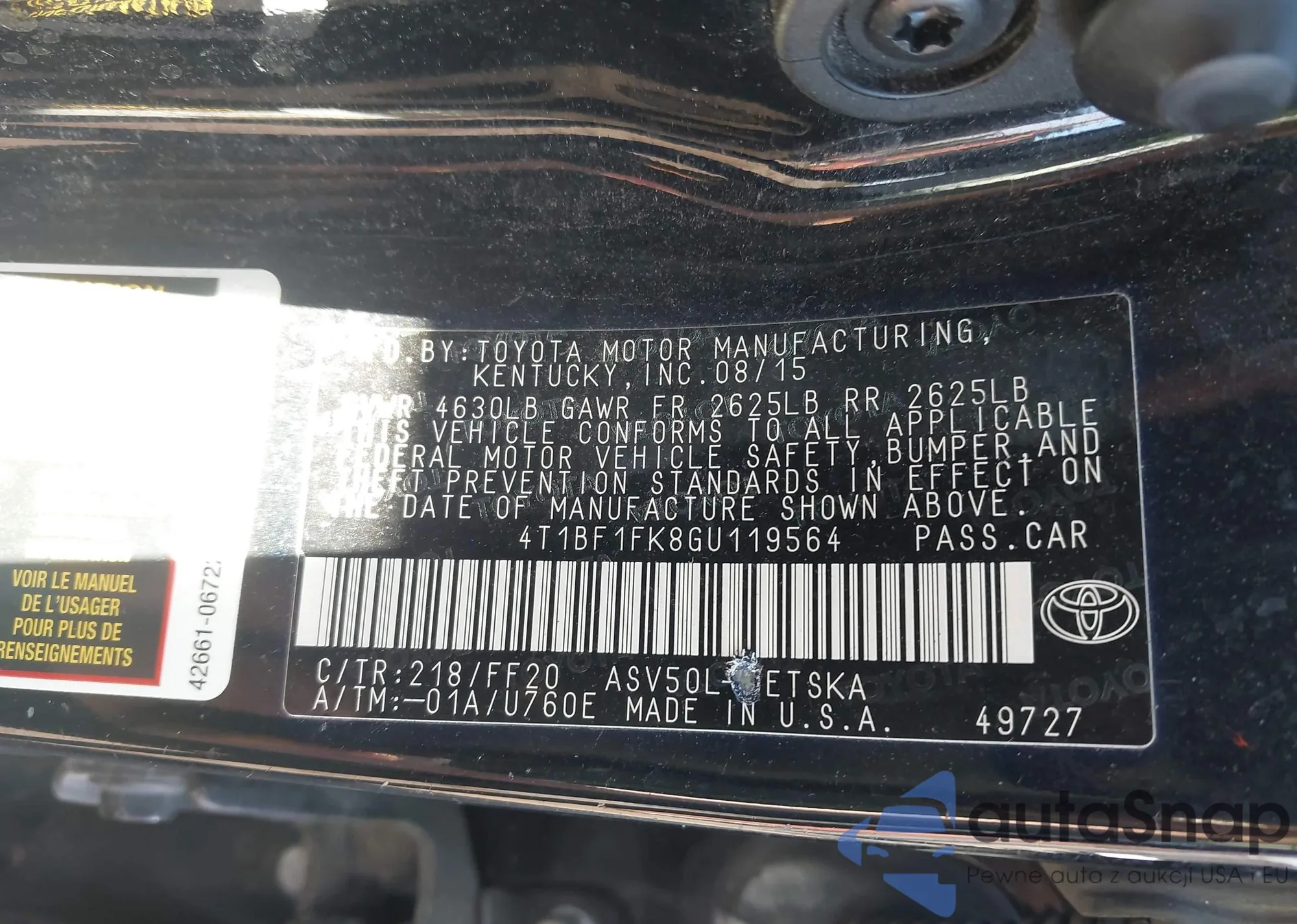 • VIN 4T1BF1FK8GU119564