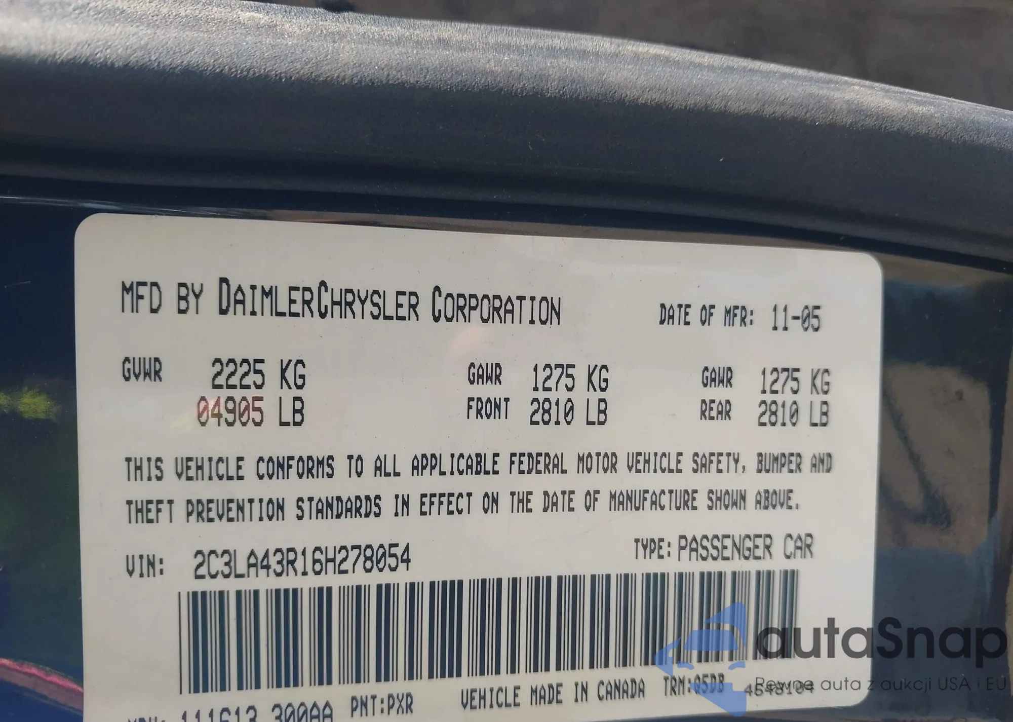 LOT: 43351893 VIN: 2C3LA43R16H278054