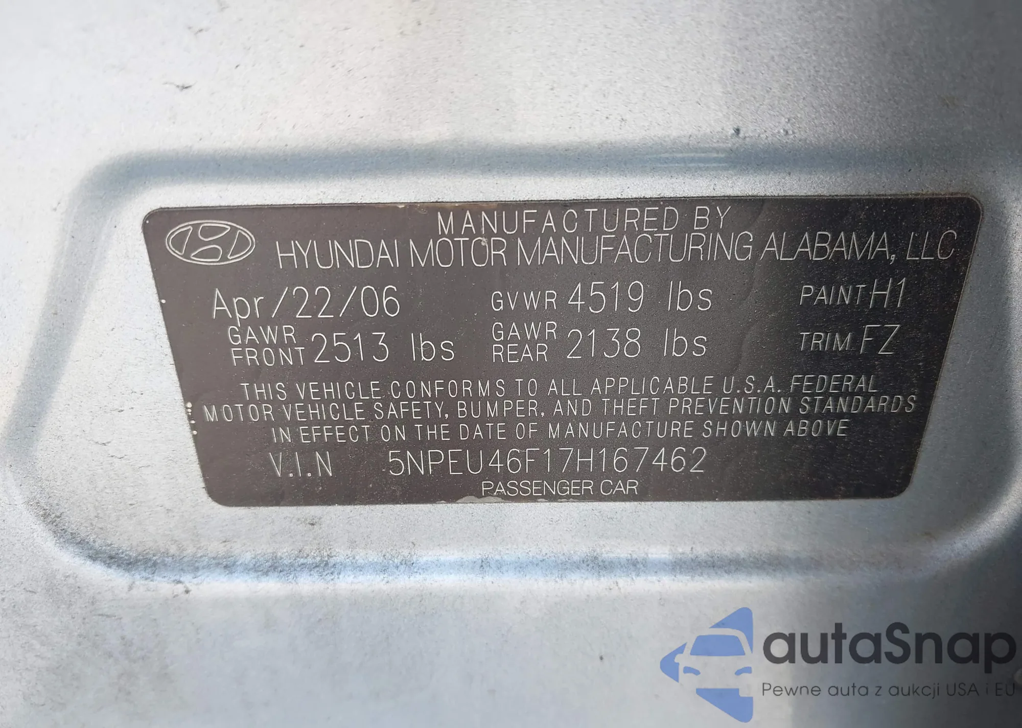 LOT: 43195120 VIN: 5NPEU46F17H167462