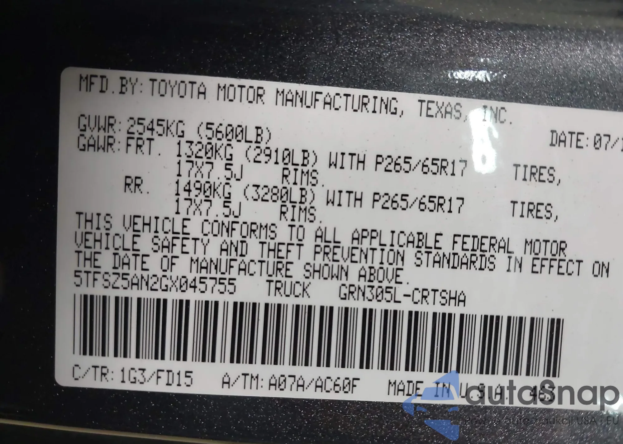 • VIN 5TFSZ5AN2GX045755