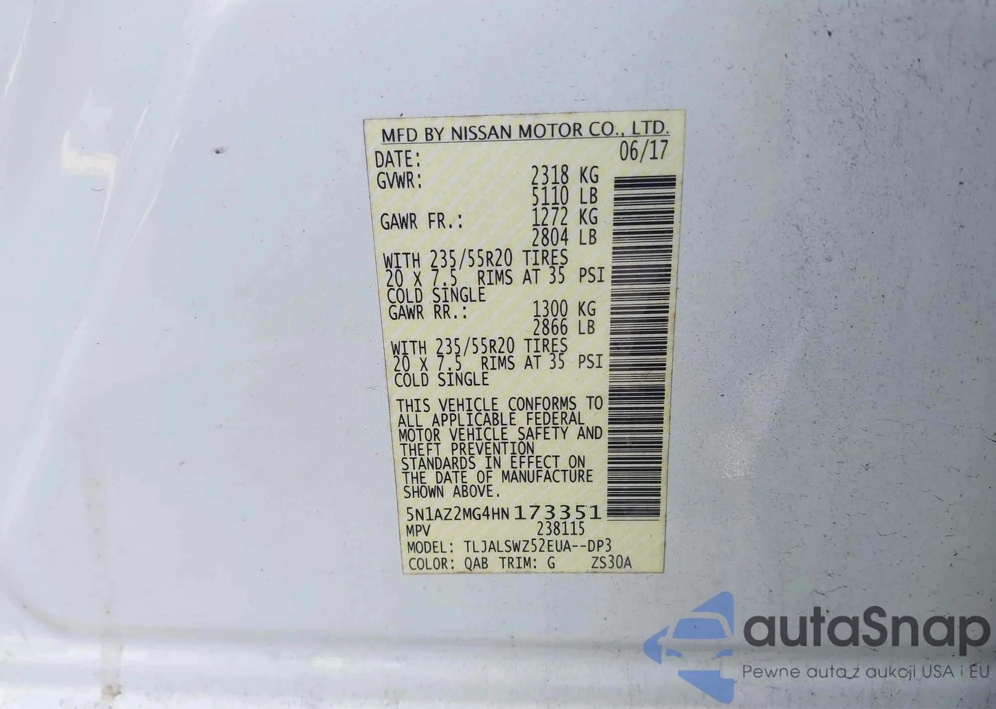 • VIN 5N1AZ2MG4HN173351