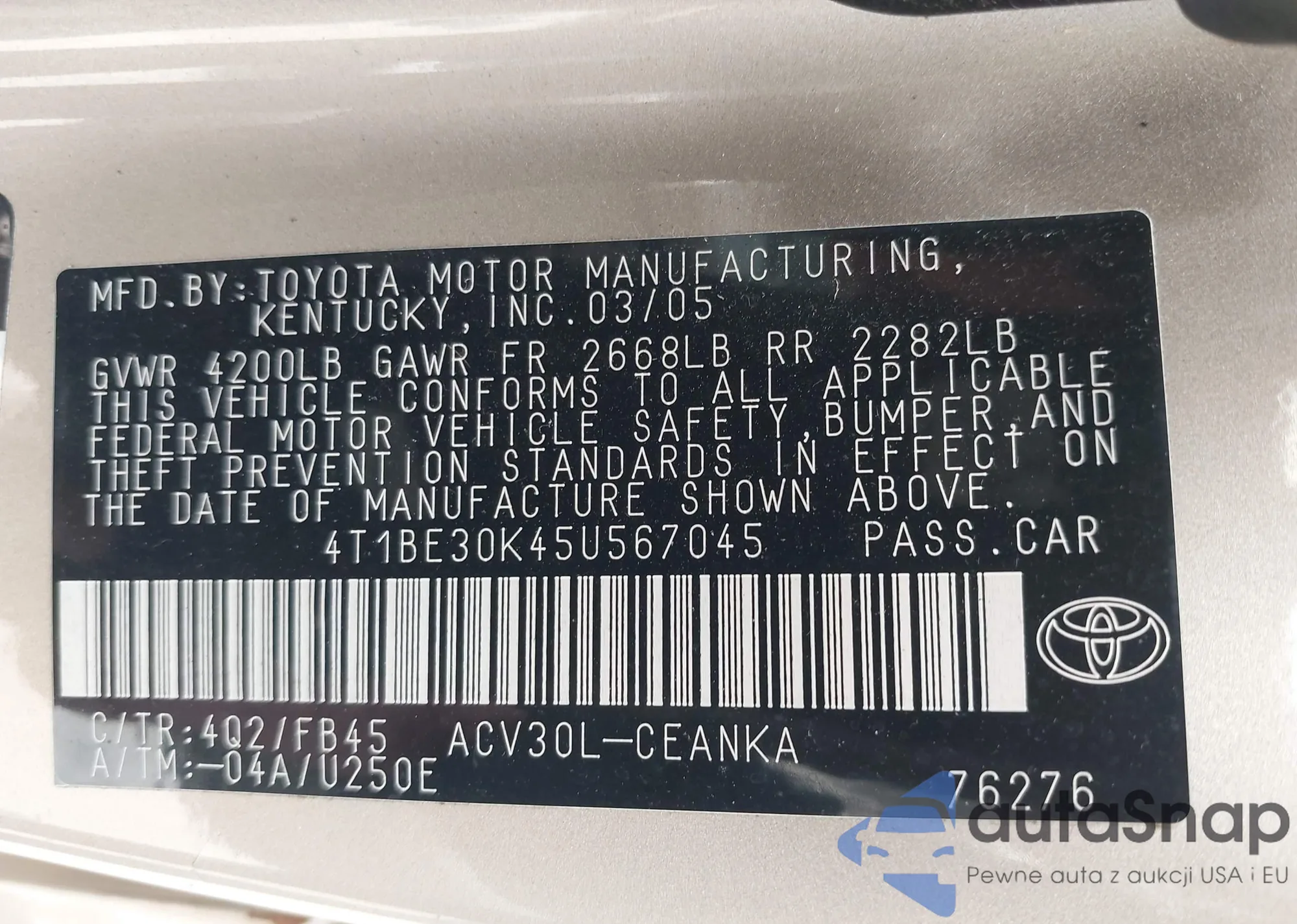 • VIN 4T1BE30K45U567045