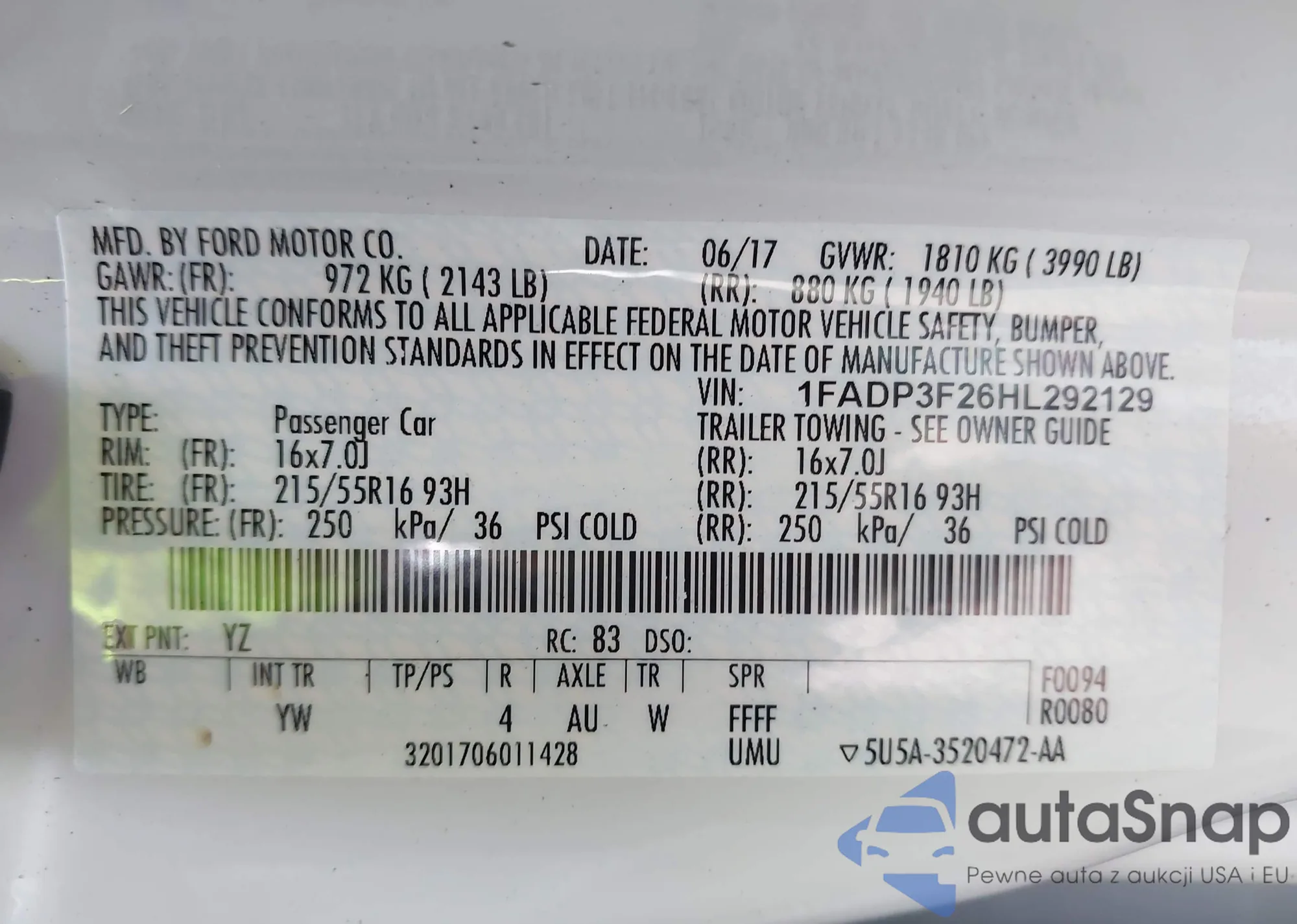 LOT: 43250208 VIN: 1FADP3F26HL292129