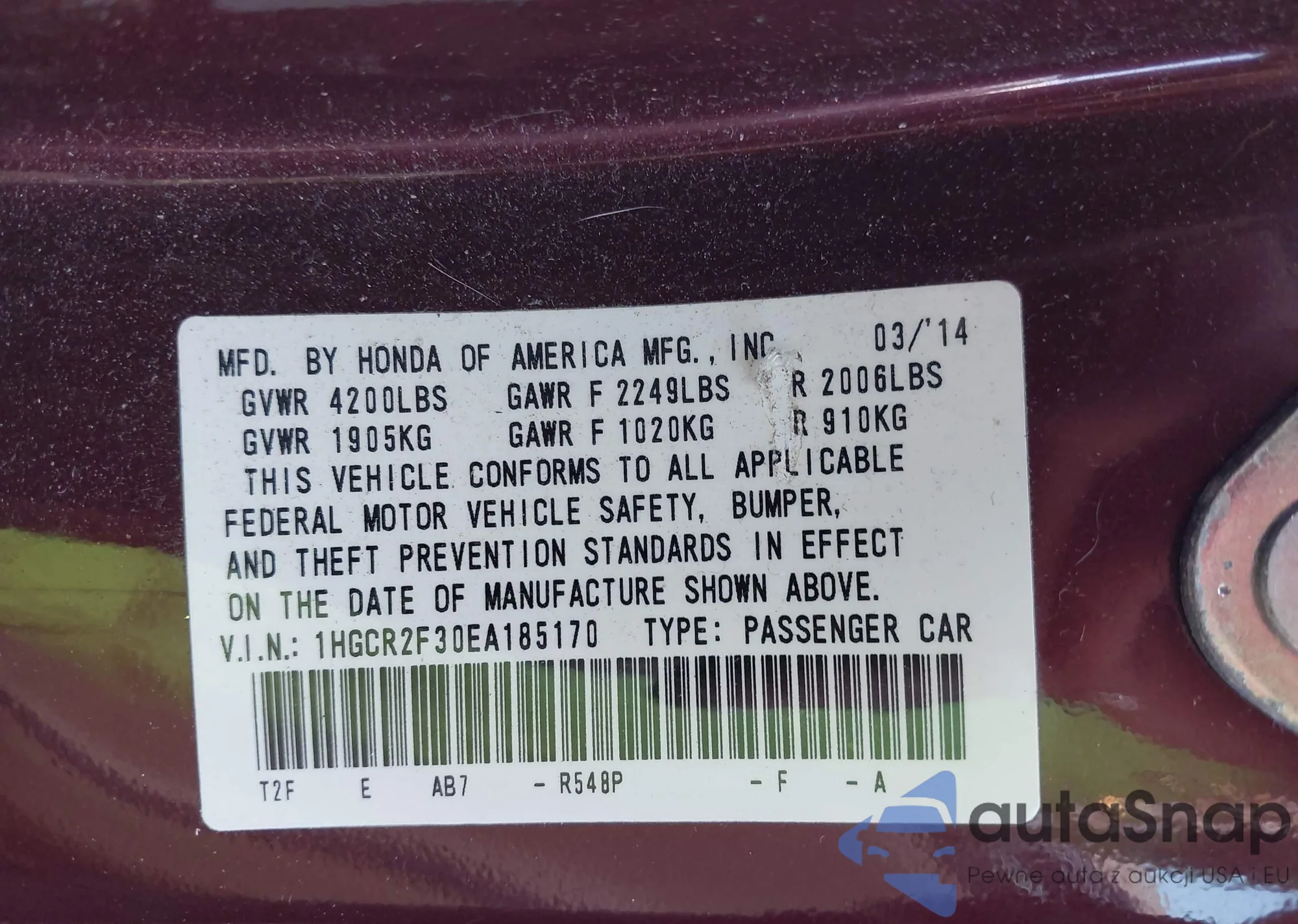 LOT: 43250657 VIN: 1HGCR2F30EA185170
