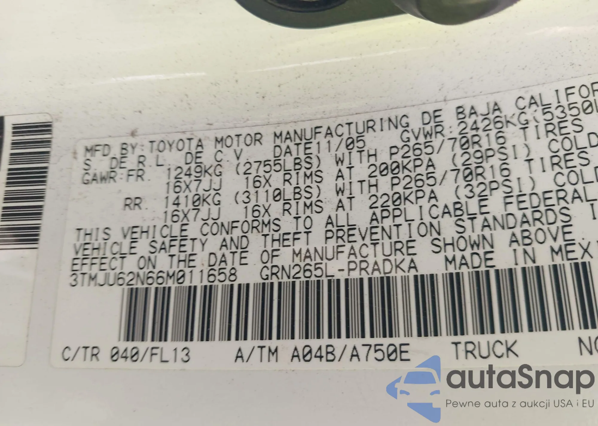 • VIN 4T1BF1FK5GU267235