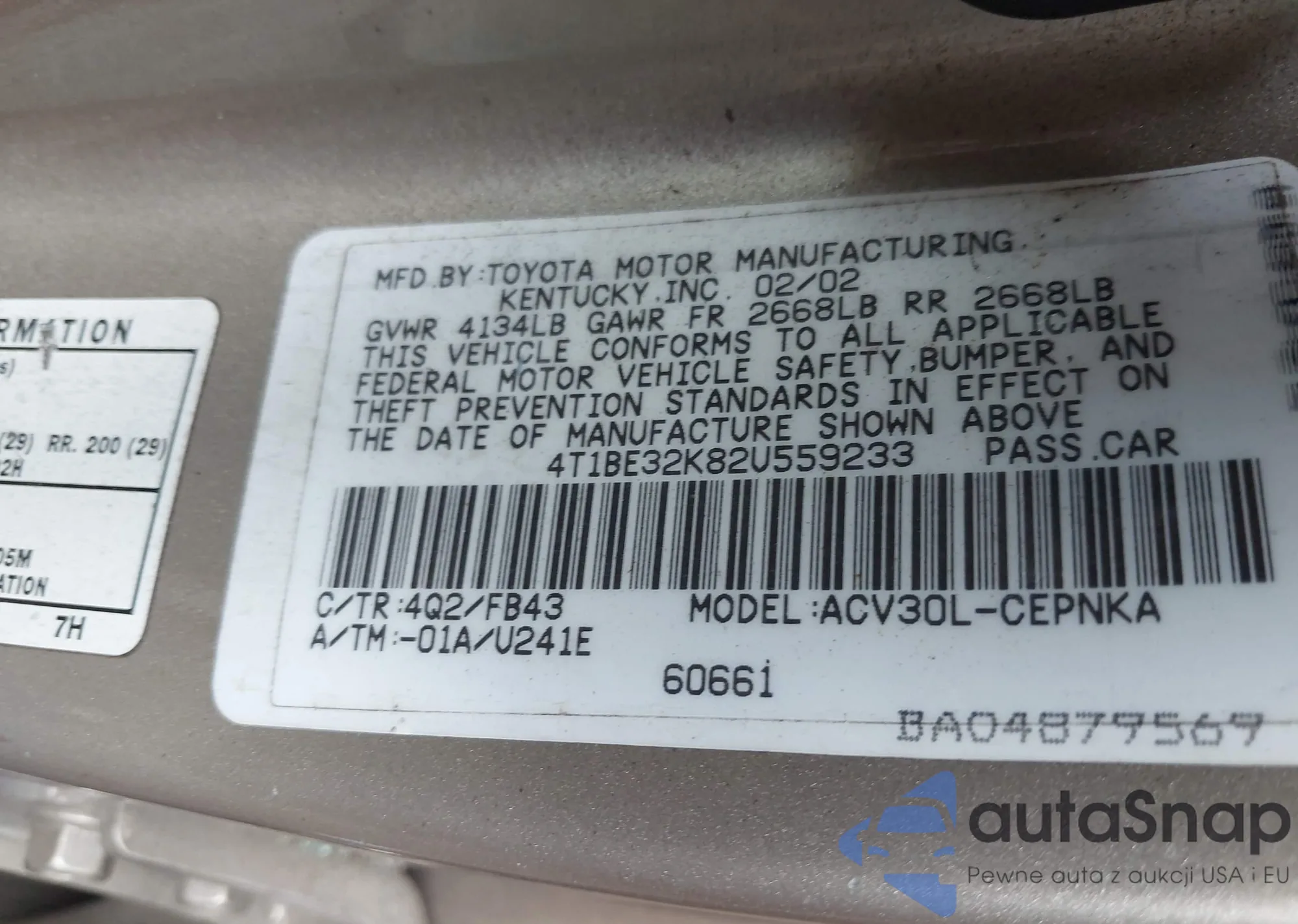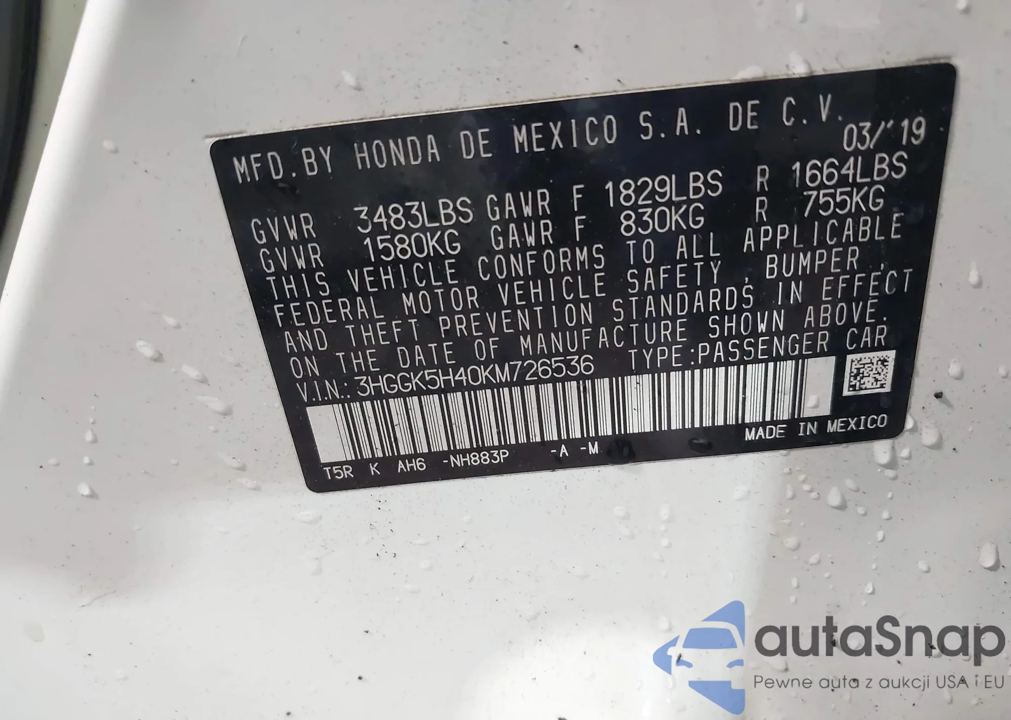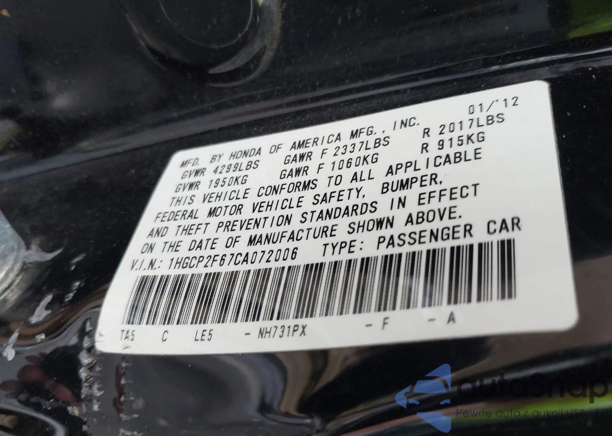 LOT: 43276015 VIN: 1HGCP2F67CA072006