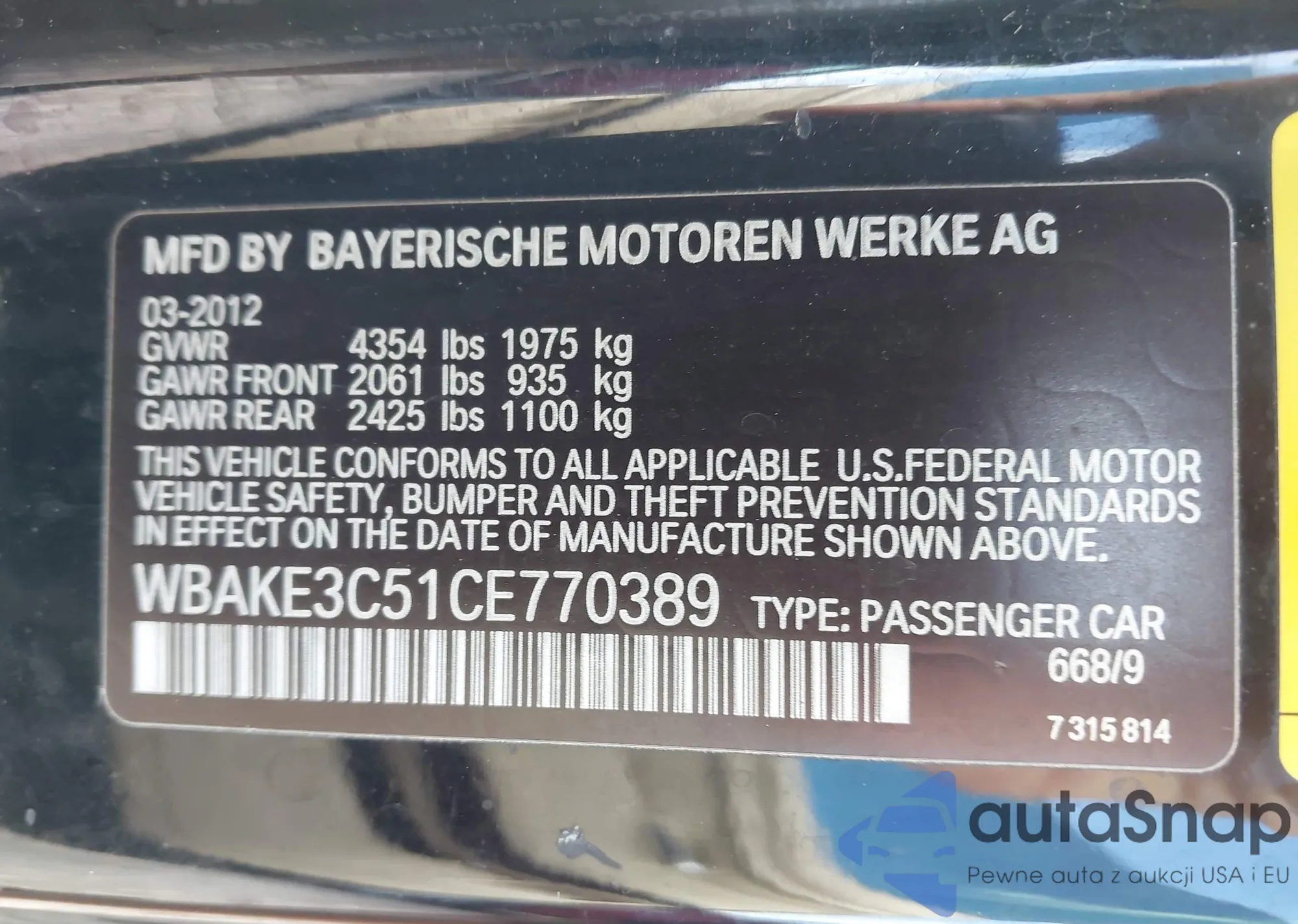 LOT: 43285189 VIN: WBAKE3C51CE770389