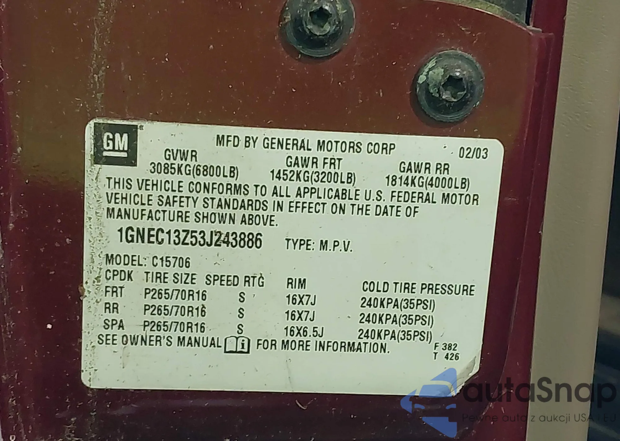 • VIN 1GNEC13Z53J243886