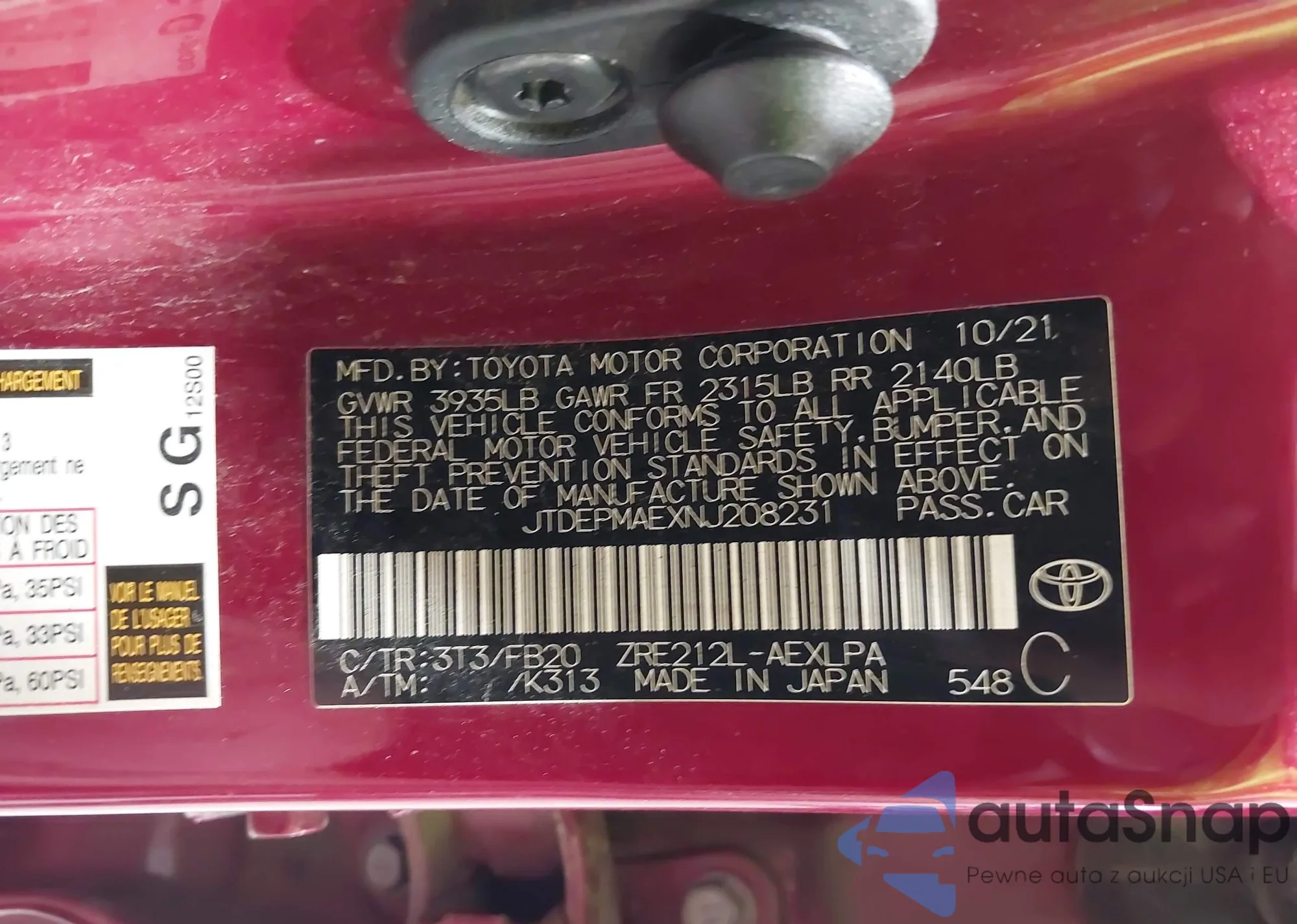 LOT: 42974205 VIN: JTDEPMAEXNJ208231