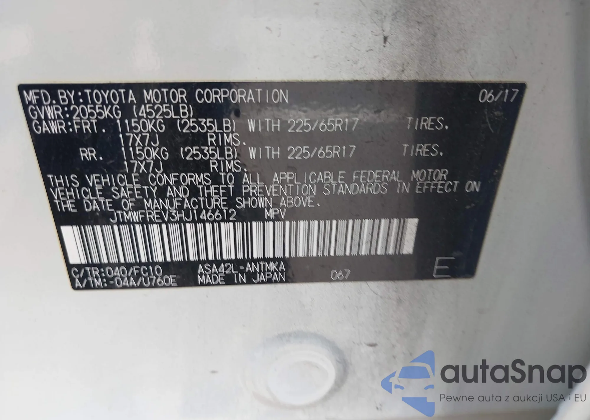 LOT: 42448306 VIN: JTMWFREV3HJ146612