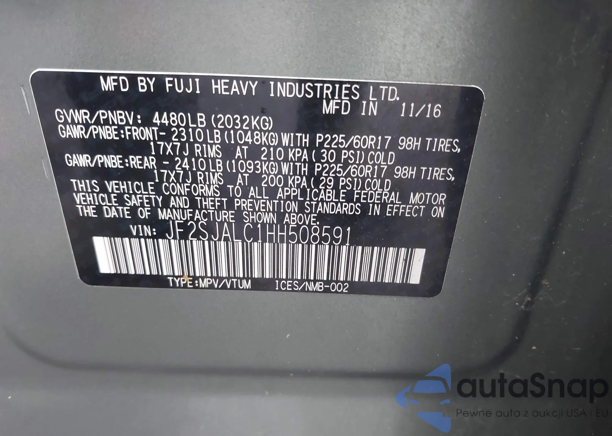 LOT: 43309945 VIN: JF2SJALC1HH508591