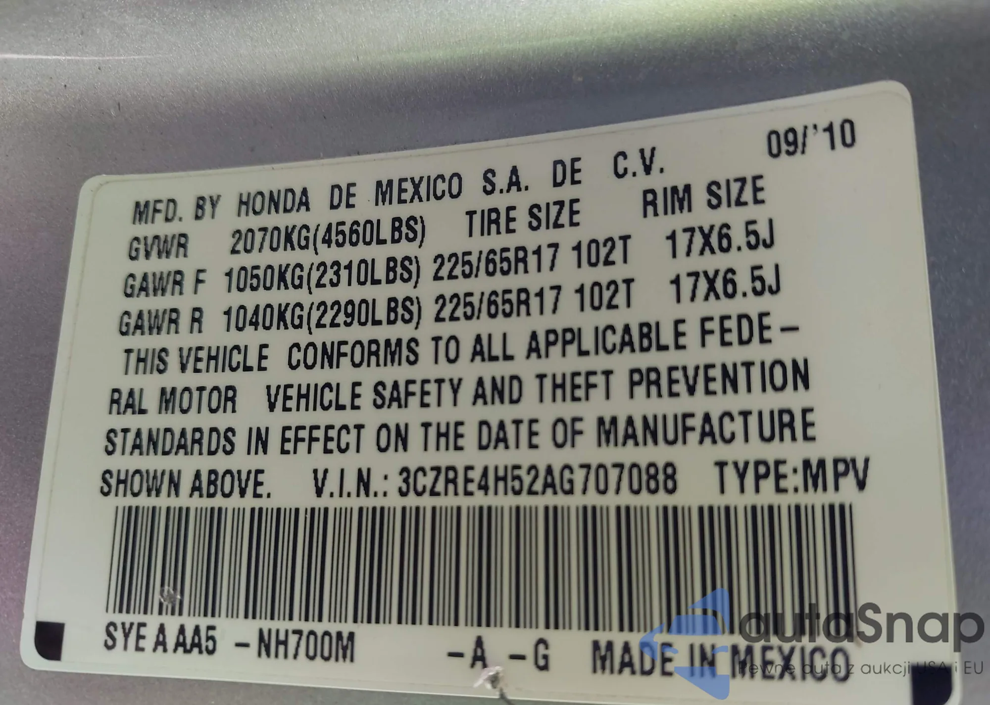 • VIN 3CZRE4H52AG707088