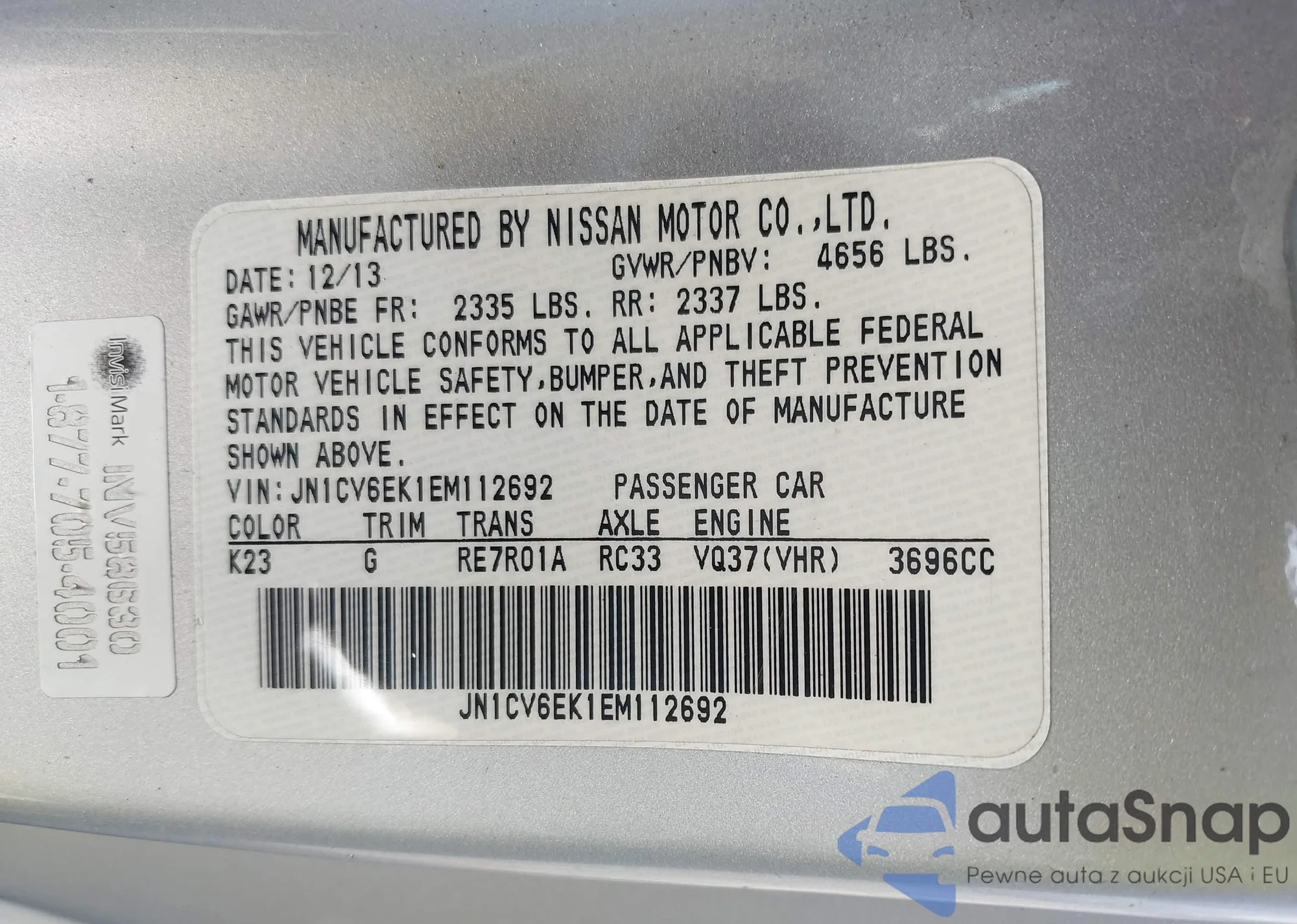 LOT: 43023460 VIN: JN1CV6EK1EM112692