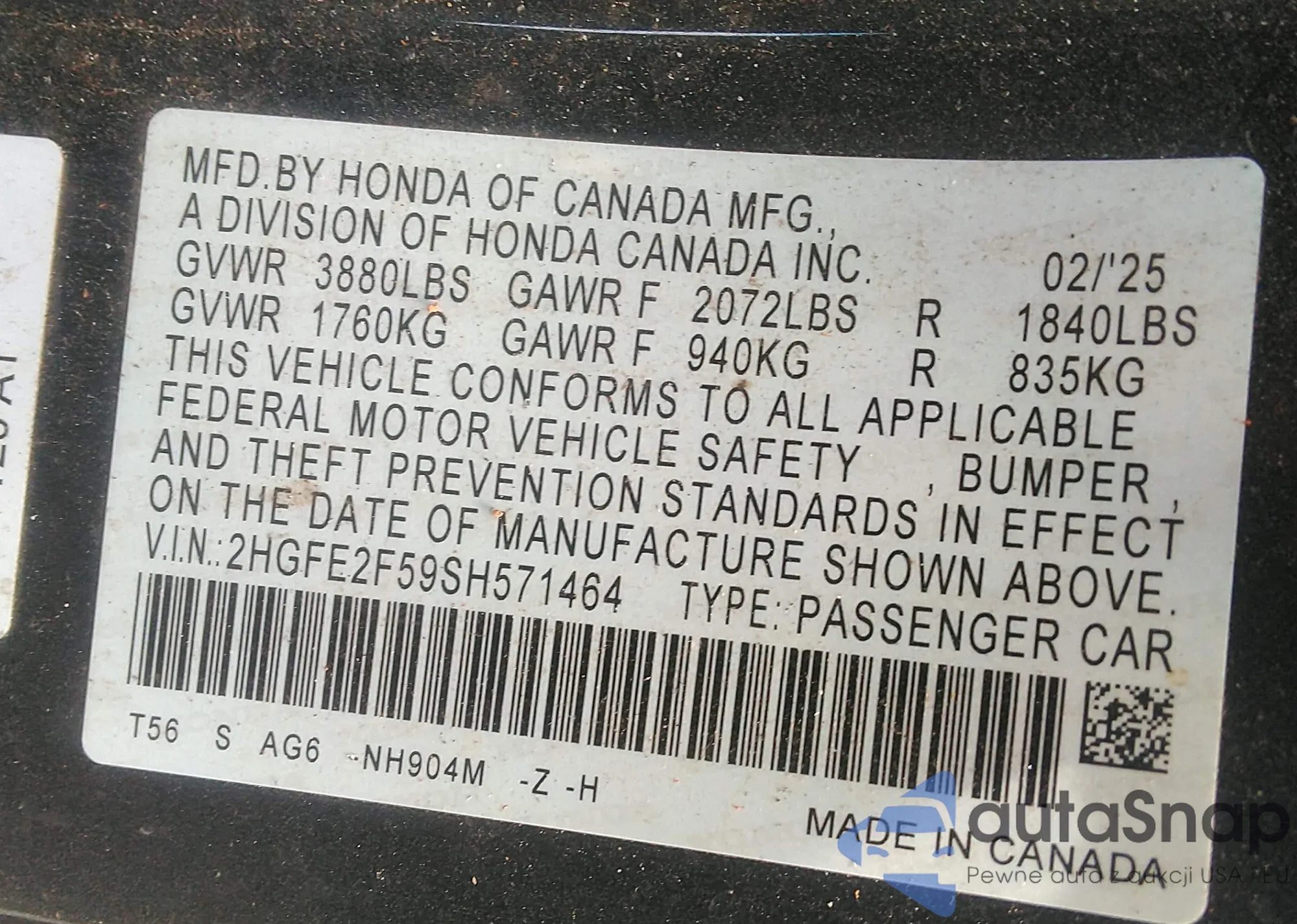 • VIN 2HGFE2F59SH571464