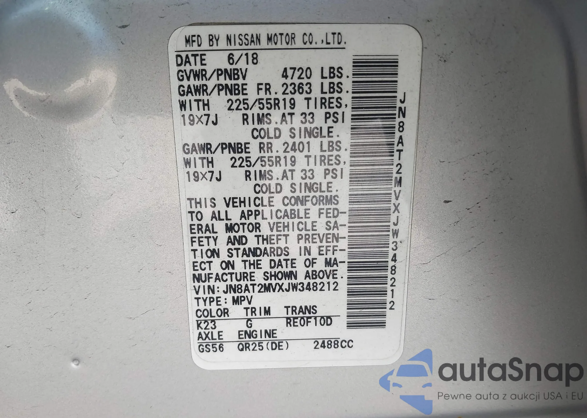 LOT: 43128511 VIN: JN8AT2MVXJW348212