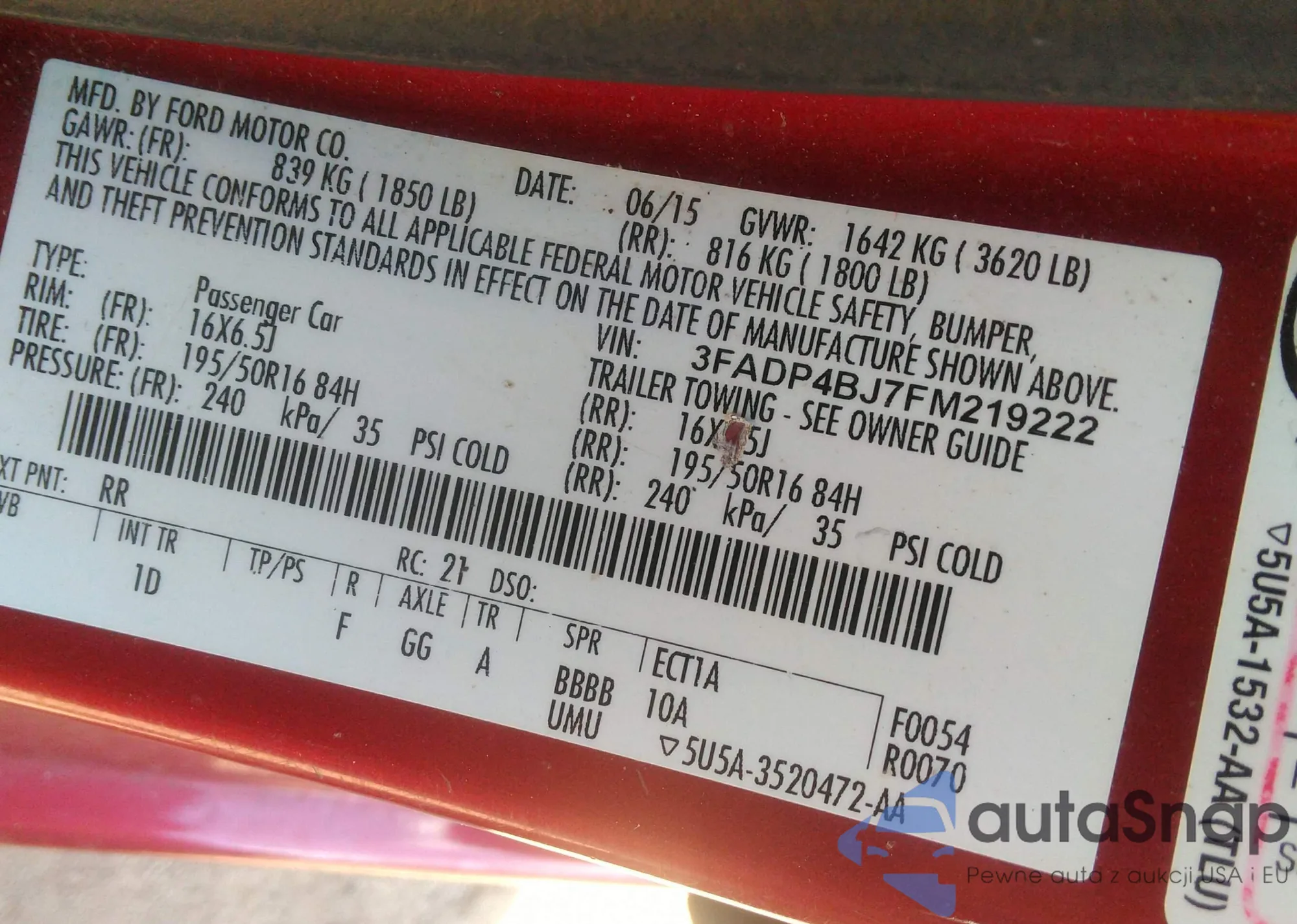 LOT: 43206807 VIN: 3FADP4BJ7FM219222