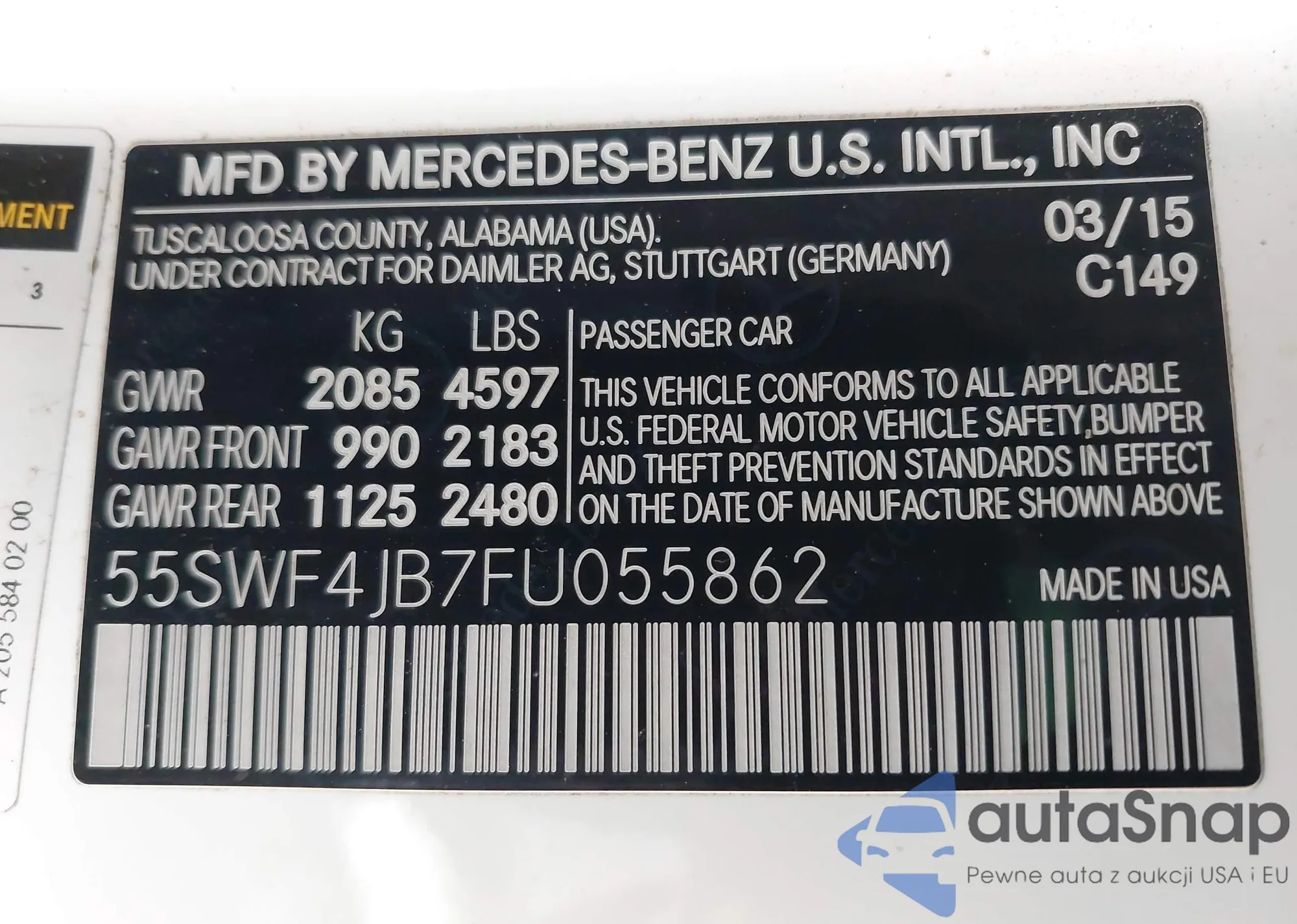 2015 Mercedes-Benz C 300 from USA, damaged, VIN 55SWF4JB7FU055862