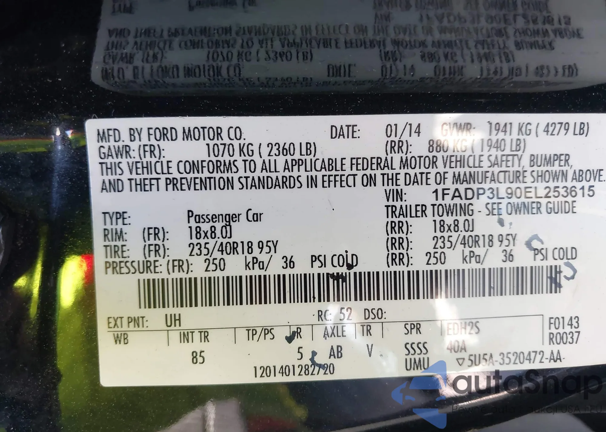 • VIN 1FADP3L90EL253615