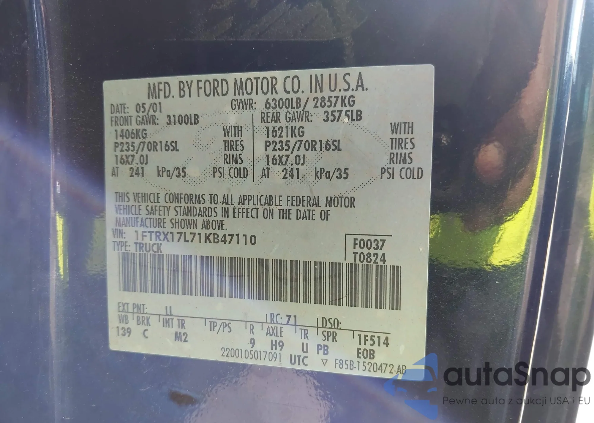 • VIN 1FTRX17L71KB47110