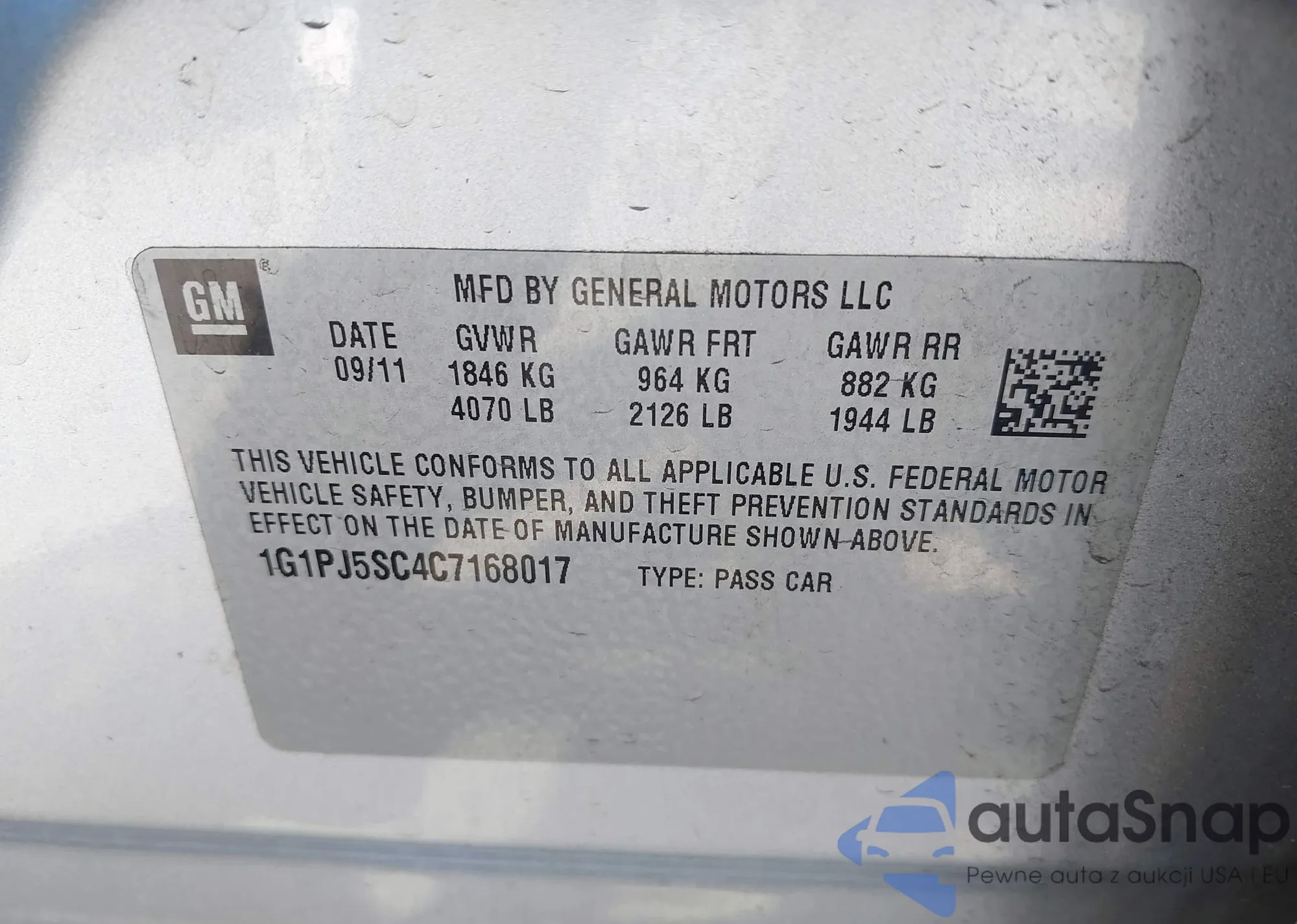 LOT: 43159314 VIN: 1G1PJ5SC4C7168017