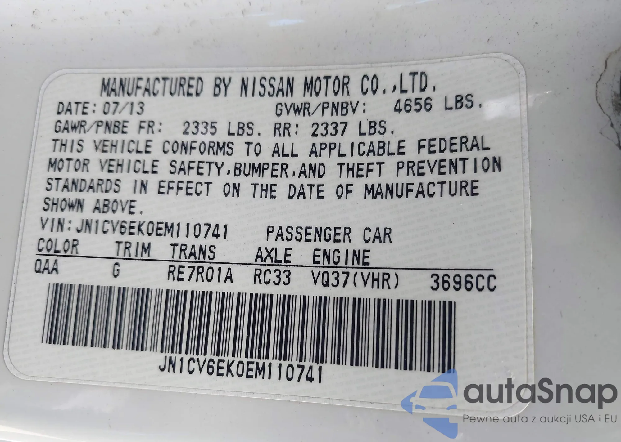 LOT: 43184004 VIN: JN1CV6EK0EM110741